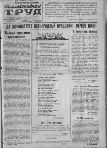 /Ое>у М СклЭ д у Пролетарии всех стран, соединяйтесь! *Ж Ъ М1е & п ш $ н $ ш Т Р У Д Орган Карасукс кого райкома ВКП( б) и районного Совета д е пут атов трудящихс я, Новосибирской области № 2 9 ( 1 0 4 3 ) Четверг, 1 мая 1947 года Ц е н а н о м е р а 1 5 к о п е е к Колхозники и колхозницы, рабочие и работницы МТС и совхозов , работники сельского хозяйства! Умножайте ряды передовиков социалистического сельского хозяйства, мастеров высоких урожаев, о р деноносцев и Героев Социалистического Труда! Больше звеньев, бригад, колхозов, совхозов , МТС и районов высоких урожаев! ( И з Призывов Ц К В К П ( б ) к 1 - м у Мая 1 9 4 7 г . ) . ДА ЗДРАВСТВУЕТВСЕНАРОДНЫЙ ПРАЗДНИК-ПЕРВОЕ МАЯ! Боевой праздник трудящихся Сегодня—второй Первомай, который мы празднуем в мирных условиях после четырех лет тяжелой войны с черными силами фашизма. Первомайский праздник родился как. м е ж д у народный праздник труда, как. праздник т р у ж е ников, которые е же г о д но в этот день п р о и з в о дят смотр своим боевым силам. В поб е доно с ной битве с фашизмом советский народ отстоял свое право на свободный т руд—величайшее право, завое ванное в Октябрьской социалистической революции. Руководимый коммунистической п а р тией, возглавляемый великим Сталиным, с о в е т ский народ в Отечественной войне разгромил фашистских з л о д е е в—заклятых врагов т рудящих ся, гнусных разрушителей и варваров. Со в е т ский народ спас человечес тво от фашистских погромщиков и поработителей. Теперь Советский Союз последовательно боре т с я против тех, кто мешает установлению прочного мира, пытается вновь по сс орит ь н а р о ды. Минувшая война многому научила народы и они отлично разбираются, кто враг и кто друг мира и благополучия во всем мире . Тр у дящиеся з ар уб ежных стран справедливо видят в Советском Союз е прочный оплот мира и дей ствитедьной демократии. Обездоленные народы полны благодарности к СССР—искреннему другу угнетенных. Братские славянские народы - юг о с л а вы, поляки, ч е х о с л о ваки, болгары, —о с вобожд е нные Советской А р мией от фашистского зверя, строят жизнь на новых началах и с гордостью взирают на с в о е го старшего брата—русский народ. Они знают, что дело мира на ходитс я в твердых, надежных руках! Война нанесла н'чнай стране большой ущерб . Злобный враг разрушил свыше тридцати тысяч перво классных промышленных предприятий, ра зорил и разграбил около ста тысяч колхозов, р а з рушил и с же г б о л е е тысячи семисот городов и семидесяти тысяч сел и деревень, и оставил без крова около двадцати пяти миллионов человек. К трудностям, порожденным войной, прибавились трудности, вызванные засухой, охватившей в нрош л м г оду большую территорию. Пятьдесят лет не было в вашей стране такой з ас ухи. В старое , д о революционное время это вызвало 6 р массовый голод, в с е о бще е ра з о ре ние , повальна болезни. В советской стране этого не случилось. Наше народное советское правительство приняло ме ры к оказанию г ос ударс твенной помоши пострадавшим районам продовольствием, семенами и фуражом и к экономии в расходовании п р о д о вольствия. Каждый знает, что по с л е во е нные трудности велики. И каждый понимает, что пре одоле ние этих трудностей завис ит от нас самих. Наш отец и учитель Иос иф Виссарионович Сталин знает нужды народа. Он дал нам великую п р о грамму восстановления и р а з в и т а н а р о д н о г о х о - зийст