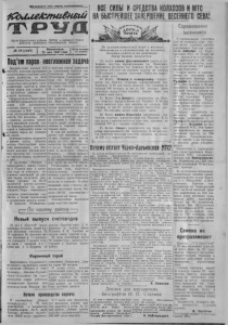 Пролвп а р а а всех стран. соединяетесь ^СЬиаеА&пи&ш м Т Р У Д Орган Ка р а с у к с к о г о райк ома ВКП(б) и районного Совета д еп у т а т о в т рудящихся , Новосибирской области ВСЕ СИЛЫ И СРЕДСТВА КОЛЗХООВИМТС НА БЫСТРЕЙШЕ ЗАВЕРШЕНИЕ ВЕСЕННЕГО С ВА! № 3 5 {1 0 4 9) Воскресенье, 25 мая 4947 года Цена номера 15 копеек Под‘еп/1 паор—внеотложная задана Ф е в р а л ь с к и й п л е н у м Ц К | / В К П ( б ) , н а м е ч а я п р о г р а м м у п о с л е в о е н н о г о п о д ‘е м а с е л ь с к о г о х о з я й с т в а , с о в с е й р е ш и т е л ь н о с т ь ю п о т р е б о в а л п о л н о с т ь ю о б е с п е ч и т ь с в о е в р е м е н н ы й п о д “ е м и о б р а б о т к у п а р о в д л я о з и м ы х , а в в о с т о ч н ы х р а й о н а х — д л я я р о в о й п ш е н и ц ы . О б л и с п о л к о м и б ю р о о б к о ма В К П ( б ) п р и н я л и п о с т а н о в л е н и е « О б о р г а н и з а ц и и в с п а ш к и п а р о в в к о л х о з а х и с о в х о з а х в 19 4 7 г о д у » . В э т о м п о с т а н о в л е н и и у к а з ы в а е т с я , ч т о к о л х о з ы , М Т С и с о в х о з ы д о л ж н ы п р и л о ж и т ь м а к с и м у м у с и л и й , ч т о бы б о л ь ш е п о д н я т ь м а й с к и х п а р о в и в ы п о л н и т ь п л а н п о ^ ’, в с п а ш к е п а р о в н е п о з д н е е 1 ^ 2 0 и ю н я . З н а ч е н и е п а р о в , п о д н я т ы х в р а н н и е с р о к и , о б щ е и з в е с т н о . М н о г о л е т н я я п р а к т и к а п о к а з ы в а е т , ч т о н а и б о л е е в ы с о к и е у р о ж а и я р о в ы х к у л ь т у р м ы п о л у ч а е м п о ч и с т ы м п а р а м , п о д н я т ы м в м а е . В к о л х о з а х « В п е р е д к к о м м у н и з м у » , и м е н и С т а л и на и « П е р в о е м а я » в п р о ш л о м г о д у н а у ч а с т к а х , з а с е я н н ы х п ш е н и ц е й п о р а н н им п а р а м , п о л у ч и л и п р и б а в к у у р о ж а я на 3 0 - 4 0 п р о ц е н т о в п р о т и в п о с е в о в , п р о и з в е д е н н ы х п о в е с н о в с п а ш к е . П а р ы — в а ж н е й ш е е с р е д с т в о у н и ч т о ж е н и я с о р н я к о в , а т а к ж е н а к о п л е н и я и с о х р а н е н и я в л а г и в п о ч в е . В к о л х о з е « П я т и л е т к а » к п о д ' е м у п а р о в п р и с т у п и л а т р а к т о р н а я б р и г а д а т о в . Г о л е н к о в а . В с п а х а н о у ж е 12 г е к т а р о в . Т р а к т о р н а я б р и г а д а т о в . В е т р о в с к о г о и з О к т я б р ь с к о й М Т С в к о л х о з е « З а в е т И л ь и ч а » п о д н я л а 2 8 га п а р о в . О д н а к о в н е к о т о р ы х к о л х о з а х н е и з ж и т а е щ е в р е д н а я п р а к т и к а к о м н а н е й щ н - н ы . Ж д а т ь , п о к а б у д е т з а с е я н п о с л е д н и й г е к т а р , а п о т о м п е р е к л ю ч а т ь с я н а п а х о т у — з н а ч и т у п у с т и т ь л у ч ш и е с р о к и п о д ъ е м а п а р о в , п о т е р я т ь о г р о м н у ю п р и б а в к у у р о ж а я в 1 9 4 8 г о д у , к о т о р у ю д а д у т в о - в р е м я в с п а х а н н ы е и х о р о ш о о б р а б о т а н н ы е п а р ы . В т о м ж е к о л х о з е „ П я т и л е т к а » с е в з а к о н ч и л и е щ е 15 м а я . О д н а к о н а п о д ‘е м п а р о в д о с е г о в р е м е н и н е в ы д е л е н о ни о д н о г о к о н н о г о п л у г а . Т а к а я ж е к а р т и н а в к о л х о з а х « П а м я т ь И л ь и ч а » , « Ж а н а т у р м ы с » и д р у г и х , з а к о н ч и в ш и х с е в и н е п е р е к л ю ч а ю щ и х ж и в о е т я г л о на п о д ”е м п а р о в . Н е о б х о д и м о , п о м е р е з а в е р ш е н и я с е в а , в ы д е л и т ь о п р е д е л е н н о е к о л и ч е с т в о к о н н ы х п л у г о в и т р а к т о р о в н а в с п а ш к у п а р о в в к а ж д о м к о л х о з е и с о в х о з е . О с о б о е в н и м а н и е н а д о у т е л и т ь к а ч е с т в у з а г о т о в к и п а р о в . П а х о т а — 2 0 - 2 2 с а н т и м е т р а — н е п р е л о ж н ы й з а к о н . С в о е в р е м е н н о в ы п о л н и м п л а н п о д ' е м а п а р о в ! г— По нашему району — ц Новый выпуск