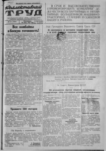 Пролетарии всех стран, соединяйтесьI &Ъиле&та6нбш Т Р У Д Орган Кар а с у к с к о г о райкома ВКП(б) и районног о Совета депутатов трудящихся , Новос ибирс кой области л / (//)/?«> Воскресенье, Ц е н а н о м е р а Л Я «/ ( 1170 0 ) 15 ИЮ НЯ 1947 года / д к о п е е к * В С Р О К И ВЫСОКОКАЧЕСТВЕННО О Т РЕМ ОНТИ РО ВА ТЬ К О М Б А Й Н Ы - Д Е Л О ЧЕСТИ ВСЕХ ПАРТИЙНЫХ И НЕПАРТИЙНЫХ Б О Л ЬШ Е В И К О В М АШИННО - ТРАКТОРНЫХ СТАНЦИЙ И С О В Х О З О В НАШЕГО РАЙОНА. В се комбайны в боевую готовность! Уборка у р о ж а я в К улун - де начинается г о р а з д о раньше, чем в д р у г и х районах нашей о б л а с ти . В-рей-я д о начала косовицы, о зимой ржи и ранних яровых к у л ь тур о стается о ч е н ь мало. Р ожь у ж е начинает к о л о ситься. Страдная пора с каждым дн ем п р и б л и ж а е т ся . К о м б а й н - -р еш аю щ а я у б о рочная машина. , З н а ч е н и е к о м б ' й н а с о ст о и т в том, чт о о н п о м о г а е т у б р а т ь у р о ж а й в о - в р е - мя. Э т о о ч е н ь б о л ь ш о е и с е р ь е з н о е д е л о , т о в а рищи... Е г о з н а ч е н и е еще состоит в т о м , чт о он и з б а в л я е т н ас от г р о м а д н ы х п о т е р ь 1. (Сталин). Чувствуя всю полноту ответственности за проведение уборки у рож а я в к о л хозах, комбайнеры, штурвальные и механики Хоро- шинской МТС обратились ко всем комбайнерам К ар а сукского района с призывом—своевременно и к а ч е ственно отрем он те рова ть вс е комбайны. Хорошинцы о б я зались привести в боевую готовность свои степные корабли к 20 июня. О б я за тельства подтв ерждаютс я делом. К 15 июня Хоро- шинская МТС подготовила к уборке около 50 поцен- тов машин, остальные находятся в стадии ремонта. Однако общее положение с ремотом комбайнов в ос тальных МТС района вызывает серьезную опасность. Особенно н еудовлетвори тельно готовят комбайны в Карасукской МТС. Из 29 машин зд ес ь почти не о тр е монтировано ни одной. Д и р е к т о р МТС тов. Решедь- ко и механик по комбайнам тов. Пристяжнюк причину срыва графика ремонта комбайнов об ясняют отсутствием радиаторов к моторам, нехваткой пиломатериала и дру гих д ета лей. Спрашивается, почему же руководители МТС не беспокоились о ремонте комбайнов раньше? Подобное положение в Студеновской МТС. При плане ремонта в 15 машин здес ь та кж е не подготовили ни одного комбайна. Дальнейшая за тяж ка с ремонтом к омбайнов—-преступление перед государством Н е обходимо принять самые чрезвычайные меры к резкому усилению темпов ремонта комбайнов. Особое внимание должно быть уд е лено качеству ремонтных работ. Государственные к о миссии по приемке готовых комбайнов должны п р о я в лять особую принципиальность при п ров ерке машин. Ибо возможно, что некоторые МТС, в погоне за тем пами, вытолкнут из мастерс к о й непригодные машины. Комбайнерам предстоит выполнить почетную з а д а ч у —образцово завершить сельскохозяйственный год. Они будут подводить итоги напряженного труда к о л хозников и колхозниц. Святой д ол г к аж до г о к о м байнера—отлично подготовить свою машину до нач а ла хл ебоуборки . Высокому у рож аю—д о с тойную встречу! Прополото 2 3 0 ге к та р о в Б а р х а т н ы м зеленым ковром покрылись поля сел ьх о зар тели «Первое а в г у с т а » . Д о уж н ы е всходы обещают бо га тый у р о жай. К о л х о з н и к и прилагают свои у си ли я , чт обы содержат ь всходы в чистоте. Н а борьбу с с о р н я к а м и ежедневно в поле в ы х о д я т 3 5 - 4 0 человек. З в е н ь я т. т . Дав нишней и П у з ы р е н к о со ревную т ся . 12 мая 