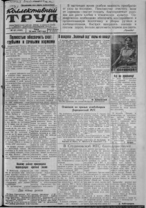 , / о » Пролетарии вс е х стран, соединяйтесь 1Сбиае&пш€нбШ Орган Кар а с у к с к о г о райкома ВКП(б) и районног о Сове т а д е п у т а т о в т рудящихс я , Но в ос ибирс к ой об ла с т и Мк 4 2 { 1 0 5 6 ) Среда, 18 июня 1947 года Ц е н а н о м е р а 1 5 к о п е е к В настоящее время о с о б ую важность приобретает у х о д за посевами. Повсеместно очистить поля от сорняков—значит создать благоприятные у с л о вия для роста хлебов и технических культур. О д новременно необходимо обеспечить всестороннюю и организованную подготовку к уборке урож ая и хлебозаготовкам, быстрее завершить сенок ос и подъем паров, больше заготовить кормов для скота. „П р а в д а " Полонтсью обесепчтиьскот грубыми и сочными кормами I I февральский Пленум ЦК ВКП|б) поставил задачу у в е личить план заготовок грубых и сочных кормов на \ 1947 год по мере под'ема животноводства. Чтобы создать сытую зимовку скоту в стойловый период 1947— 1948 г., к о л хозы нашего района нынче должны заготовить сена 40 тысяч тонн, сллоса 14 тысяч тонн В разрезе районного плана доведен план каждому колхозу по заготовке к о р мов с указанием сроков их выполнения. С этой целью с руководителями колхо зов было проведено инструкдвное совещание. Но н е с мотря на все это, колхозы района крайне неудовл етво рительно развертывают с е нокошение и силосование. Из общего наличия в колхозах 335 с енокосилок о т ремонтировано только 315, из 233 ло б о гр е ек о тр е монтировано в с е го - н а в с е го 19, конных граблей имеется 230, отремонтировано же 179. Колхозы Нестеров- ского сельсовета: «Труд», «Жана Инбек» и «Свободный труд», Черно-Курьин- ского—«Коминтерн», «Новая семья», «Жана Жсл» и ряд других по состоянию на 15 июня еще не приступили к сенокошению, не взирая на то, что план с е нокошения установлен с 5 июня. Из 84 колхо зов в районе на 15 июня приступил к сеноуборочной кампании только 71 колхоз. С 5 по 15 июня скошено с е на только 1944 га и заскирдовано 4767 центнеров. Не лучш е обстоит дело и с заготовкой силоса. 29 колхозов к 15 июня еще не приступили очищать силосные ямы. Колхоз „Джеста- •'•ап4, Карасартовского сель совета, д елает ямы для з а к ладки силоса на низких местах, что грозит прямой гибелью силоса. Силосованию кормс-в большинство к олхо зов не уделяют д о л жного внимания. В 194(1 году из всего заложенного силоса ока за лос ь годного то л ьк о 20 процентов, | ос тальной погиб. В ряде кол хозов в силосные ямы зак ладывали сухую, перестоявшую на корню т р а в у , с о р няки, камыш и др. п е р е с тоявшие растения, которые не могли пройти процесс брожения и весь корм сгнил в ямах. В результате многие колхозы оказались без корма, что повлекло к всевозможным заболеваниям и массовому падежу животных. Прошлогодние ошибки, как видно, ничему не научили отдельных руководите лей к олхо зов Они и нынче наплевательски относятся к з а го то в к е кормов. А председатели та ких ко л х о зов, как: «Красный боец»; «Красный путь», им. М. Г о р ь ко г о , «Новый труд», „ Ж а н а Ж о л " , «Новый свет», «Карасу-казах», «Жана Тур- мыс», „Новая с е м ь я 1, им. Молотова совершенно не сеяли прифермские участки. Время сенокоса и силосо вания началось. Надо, не- теряя ни одного дня, все силы и с р едств а колхозов и со вх о зо в переключить на заготовку кормов и п о л н о с т ь ю з а к о н ч и т ь с е н о у б о р к у , в к л ю ч а я и с т о г о в а н и е с ен а , д о н а ч а л а у б о р к и х л е б о в . Колхозники, рабочие МТС и с овхоз