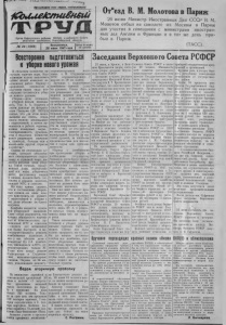 Пролетарии всех стран, соединяйтесь 1С оиие& т и#нбШ Орган Карасукского райкома ВКП(б) и районного Совета д е п у т а т о в трудящихся, Н ово си би р ск ой о б л а с т и № 4 4 (1 0 5 8) Воскресенье, IЦена номера 29 И Ю Н Я 1947 гола I 15 копеек 0 т “е з д В. М. Молотова в Париж 2 6 и ю н я М и н и с т р И н о с т р а н н ы х Д е л С С С Р В. М. М о л о т о в о т б ы л на с а м о л е т е и з М о с к в ы в П а р и ж д л я у ч а с т и я в с о в е щ а н и и с м и н и с т р а м и и н о с т р а н н ых де л А н г л и и и Ф р а н ц и и и в т о т же д е н ь п р и б ы л в П а р и ж . ( Т А С С ) . Всесторонне подготовиться к уборке новогоурожая В сельском хозяйстве наступила горячая пора. Колхозникам нужно выполнить сейчас целый комплекс не отложных работ. Наряду с прополкой, сенокосом и подъемом паров надо в с е сторонне готовиться к убор ке нового урож ая. Уборка—дело сезонное, с уборкой нельзя запаздывать. Тов. А. А. Андреев в своем докладе на ф евра л ь ском Пленуме ЦК ВКП(б) сказал, что „на этом запаз дывании мы очень, очень много теряем: запаздывают с подготовкой , а потом начинается в работе горячка, всякие пожарные меры.. Своевременность р у ковод ства в сельском хозяйстве имеет решающее значение и, пожалуй , больше чем в какой-либо другой отрасли х о з я й с т в а ”. Одним из решающих ус ловий, которое обеспечивает своевременную подготовку к страдной поре, я в ляется рабочий план убор - кл. Такой точный, п роду манный план, опр ед е л яю щий все виды уборочных работ, расстановку людей и машин, до лж ен быть составлен в каждом колхо зе, каждой МТС и совхозе. Но надо прямо сказать, что к составлению у б ороч ных планов ни один к о л хоз приступать не думает . С подготовкой к уборке у нас д е ло обстоит не благополучно. Комбайн явл яется основной уборочной машиной. Само собой разумеется, что прямая обязанность партийных и комсомольских о р ганизаций МТС и совхозов —сделать все возможное для более быстрого и высококачественного ремонта комбайновых агрегатов. А как у нас обстоят дела с ремонтом? Из 114 комбайнов, имеющихся в МТС, о т ремонтировано то л ьк о 30. Хуже всех в е ду т ремонт Карасукская и Студенов- ская машинно-тракторные станции. Первая из 24 машин, подлежащих ремонту, отремонтировала всего лишь 4. В Студеновской МТС отремонтировано 7 машин из 28 по плану. За т яж к а с подготовкой комбайнов—-прямой удар по урожаю. Стало быть в эти решающие дни самой важной задачей для партийных и комсомольских организаций должна являться мобилизация всех сил и средств на быстрейшее з а вершение ремонтных работ. Каждый комбайнер, ремонтный рабочий долж ен проникнуться чувством г о с у дарственной ответственности за порученное дело и понять, что от его работы во многом зависит успех всенародной борьбы за высокий урожай, за изобилие продовольствия для населения и сырья для промышленности. Наряду с комбайнами при проведении уборки и хлебосдачи государству большую роль б удут играть простые уборочные машины. Косилки с приводами, лобогрейки, жатки, молотилки приобретают исключительно важное значение первых дней и до конца косовицы. Вот почему ре монт их должен быть своевременно закончен. Как же идет ремонт простых машин в к о л х о з а х нашего района? Недопустимо слабыми темпами. Из 262 л обо гре ек , имеющихся в колхо зах , отремонтировано всего лишь 29. А о ремонте крытых токов , зе р но с у шилок пока что не ведут и речи. Такое положение с п од готовкой 