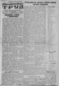 2. „КОЛЛ ЕКТИ ВНЫЙ Т РУД 2 0 июля 1 9 4 7 г о д а № 4 9 ( 1 0 6 3 ) Страдная пора начинается! З а в е р ш а я з а г о т о в к у к орм ов,— всесторонне и настойчиво готовиться к уборке б ог а т о го урожая Готовы к хлебоуборке С л а в н о потрудились к о л хозники нашей с е л ь х о з а р тели весной нынешнего г о д а . В з я в о б я з а т е л ь с т в о вы р а сти ть богатый у рож ай , мы у сп еш н о справились с весенним севом. За п о с е в а ми органи зо ван тщательный у х о д . Упорный труд к о л х о з н и к о в д ал свои р е з у л ь т а ты . Р о в н а я , густая пшеница у ж е колосится. Урожай б у д е т богатый и к вс т р е ч е е г о мы у ж е полностью подготовились. К ол хо зны е кузнецы И .Ф . Л у б я н о в и В. А. Рогожин качественно отремонтирова ли 5 л о б о г р е е к , с а м о с б р о с ку , 12 б е с т а р о к , 3 веялки, 2 сортировки и другой , необходимый для х л е б о у б о р ки, инвентарь. Плотники Иван Лапутькс и Максим Прудник восстановили вновь 6 бричек и 2 ходка . Кроме э т о г о , построены 4 крытых т о к а и з е р н о с у шилка. Оборудование д р у гой простейшей з е р н о с у шилки подходит к концу. Вы со к оу р ож ай н о е зв ен о т о в . Чайко вско го в е д е т втоПод таким заголовком в нашей газете за 22 июня была помещена заметка, в которой говорилось о неудовлетворительном ходе заготовки кормов и закладки силоса в колхозе «Новый труд». Заметка была направлена в исполком Карасукского поссовета для принятия мер. Председатель поссовета тов. Лебедев сообщил в редакцию, что факты, изложенные в заметке, подтведрились. ричную прополку на своем уч а с тк е . Члены звена вы строили крытый ток. На период уборки у р о ж ая и х л е б о з а1 о то в ок с о с т а в л е н рабочий план. За всеми участками у б о р о ч ных работ закреплены люди, инвентарь, тягло . Успешно з а в е р ш и в план заготовки к орм о в для ж и во тно водства , колхозники полны рашимости о б р а з ц о во провести у борку б о г а т о го у р о ж а я . Наши расчеты - закончить косовицу к 1 сентября, а план х л е б о з а г о т о в о к —выполнить к 10 сентября. С этой з адач ей мы с ч естью справимся. Порукой э тому служит политическая и произв одственная а к т и в ност ь наших колхозников. В оодуш евленные решением ф е в р а л ь с к о г о Пленума ЦК ВКП (б ) „О м е р а х под'ема сел ь с ко г о хо з я й с т в а в п о с левоенный период» к о л х о з ники тр удя тся на полях не покладая р у к . Ф. Полозок. Пр е д с е д а т е л ь к о л х о з а „1-е а в г у с т а * . Исполком поссоветапредупредил председателя колхоза «Новый труд» тов. Штода за плохое руководство заготовками кормов для животноводства. Исполком обязал тов. Штода использовать все возможности для усиления сенокошения искирдования с тем, чтобы до начала уборки уро/кая был выполнен план заготовки кормов. Сейчас в колхозе дополнительно включена в работу одна сенокосилка. Темпы сенуоборки значительно усилились. Отремонтировали все хлебоуборочные машины Д е я т е л ь н о г о т о в и т с я к у б о п к е н о в о г о у р о ж а я с е л ь х о з а р т е л ь * П я т и л е т к а * . В с е у б о р о ч н ы е м п ш и н ы у ж е н а г о т о в е . О т р е м о н т и р о в а н ы к р ы т ы е т о к а и а м б а р ы , и с п р а в л е н т р а н с п о р т д л я п е р е в о з к и з е р н а . К р о м е э т о г о п о с т р о е н н о в ы й з е р н о с к л а д . Л. Бочкарева . На воскреснике Учитывая создавшийся разрыв между косовцией и скирдованием ,правление сельхозартели «Новая жизнь», Студенов ского сельсовета, организовало 6 июля массовый воскресник, в кото