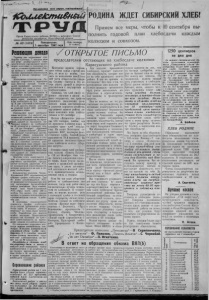 .Ся. ) Пролетарии в с е х стра н, соединяйтесь!__ 1СЪиле&ти6н$ш Т Р У Д О р г а н К а р а с у к с к о г о райкома В К П ( б ) и районн ого Сов ета де п у т а т о в т р удящ и х ся . Н о в о си б и р ск ой области № 6 2 (1076)] Понедельник, 1 сентября 1947 года Ц ена н о м е р а 15 к о п ее к РОДИНА Ж Д ЕТ СИБИРСКИЙ ХЛЕБ! Примем все меры, чтобы к 10 сен т ябр я выполнить годовой план хлебосдачи каждым колхозом и совхозом. Решщаюаядекада у ОТКРЫТОЕ ПИСЬМО 4 Горячие дни переживают хле^ б о р о б ы Кулунды. С каждым днем в с е шире разверты вается с оци алистическое соревнование труж е ников колхозных и совхо зных п о лей за успешн о е провед ение у б о р ки урожая и х л е б о за г о т о в о к , за ч е с тн ое выполнение обя зательств, данных в письме тов арищу Ста лину. Колхозники сельхозартели „П ятилетка" вырастили в нынешнем год у бо га тый урожай . Помня о с во ей первейшей заповеди они прилагают в с е силы к тому , что бы д о ср о ч н о рассчитаться с г о с у дар ств ом по хлебопост авкам. К 1 сентября колх оз отправил на заготовительные пункты 3087 центнер ов зерна, выполнив го довой план хл ебосдачи на 78,4 процента. В дни усиленной хлебосд ачи— 30 и 31 авгу ста ко лхоз доставил на ссыпной пункт 1253 центнера д о б р о т н о г о зерна. Напряженно ведут х л е б о з а г о товки кол х о зы „1 -е а в гу ста " , выполнивший го д о в о й план хл ебоза г о т о в о к на 48 процентов, им. Круп- ^ ^ ж о й , давший за последнюю пя- а б*дневку прирост по хлебосдаче на 30 процентов к го д о в о м у плану, „18 лет О к тя б р я " , „Дружный т р у д " , „Память Ильича", „К ол л ек тивный труд" и нек оторы е другие. Однако о б щ е е положение в районе с у бор к ой урожая и хлебо заготовками неудовлетворитель ное . К 1 сентября колхозы района выполнили план уборки з ер новых в с е г о лишь на 32,5 процента. Год овой план хлебо сдачи выполнен на 17,5 процента. А в г у с т о в с к о е задание п о хлебопоставкам г о с у д а р с тв у сорвано . Причины э т о г о заключаются в том, что нек о торы е руководи тели партийных организаций, пред се датели колх о зов , директора МТС не осознали в сей от ветственности , которая возлагает ся на них в период хл ебоуборки . Большинство колх озов Черно - Курьинской МТС систематически ср ываю т график хлебосдачи . Тем не менее рукововодители МТС не принимают исчерпы вающих мер длй организации бе сперебойной работы комбайнов. В е с ь комба йновый парк Черно-Курьинск ой МТС убрал в с е г о лишь 580 га х л ебов . Э т о значит, чт о каждая машина в среднем исп ользовалась производительно только 4 р а б о чих дня. В н ек оторы х сельхозартелях срывается график хлебо сд ачи из-за плохой организации подработки зер на. В колхозе „Интернационал" на т ок ах лежат вороха хлеба. Подработка е г о ведется крайне медленно. Председатель кол хоз а т ов . Кузнецов не ч ув ст в у е т о т в е т с т в енн о с ти за выполнение задания п о хлебопоставкам. По инициативе п еред овых колх о з о в п е р в а я п ят и д н е в к а с е н т я бря о б ' я в л е н а п ятидневкой у с и л е н н о й сдачи х л е б а г о с у д а р с т в у . К 5 сентября каждый колхоз должен выполнить г о д о в о й план х л е б о з а г о т о в о к не менее как на 80 процентов. М о л о т и т ь и сд а в ат ь х л е б г о с у д а р с т в у д н е м и н оч ью , с каждым днем наращивать темпы х л е б о з а г о т о в о к и не ослаблять их д о полного выполнения плана с тем, чтобы к 10 сентября район в целом завершил г о д о в о й план х л е б о сд а ч и г о с у д а р с т в у . председат