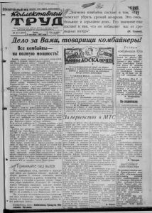 2. 3 сентября 1947 года № 63 (1077) „К О Л Л Е К Т И В Н Ы Й Т Р У Д 1* Беседы о б У к а з е П р е з и д и у м а В е р х о в н о г о С о в е т а С С С Р о т 29 м а р т а 1947 г о д а 5. За что награждаются работники сельского хозяйства медалями „За трудовую доблесть4 и „За трудовое отличие" Знаменательная дата Первое сентября—знаменательная дата для . советских школьников. Этот день глубоко войдет в детскую память. Сколько радостей, восторгов и переживаний принес он с собой. Ранним утром дети с сумочками и чемоданчиками в руках, гурьбой и поодиночке, с родителями и без родителей торопились в школу. Заведующая Карасукской начальной школы № 1 Е. Я. Рохмистрова вместе с учителями встречают будущих строителей коммунистического общества. С радостной детской улыбкой, с оживленными лицами дети входят в светлый коридор школы. На стенах висят плакаты, призывающие детей учиться только на отлично. На дверях—классные этикетки. Дети заранее знают в какой класс кому заходить, знают своего учителя. Счастливая советская детвора! Великая Октябрьская Социалистическая революция перед ними широко раскрыла двери школ. Она предоставила каждому неограниченные возможности проявить свои таланты и способности. Партия и правительство предоставили право школе и учителю воспитывать высокообразованных, культурИ Т О Г И П Р О В Е Р К И Рейдовая бригада, п р о в е рившая качество уборки урож ая в к о лхо зе „ Новый строй", отметила, что р у к о водители артели не ведут настоящей борьбы с п оте рями. На участке 4 га , у б ранном лобогрейкой , оста лось много колосьев. Сбор их не организован. Большие потери при у б о р ке допускает комбайнер тов. Б еккер . На одном кв адра т ном метре насчитывается до 7 колосьев. Получается это потому, что колосья переных, глубокоидейных строителей коммунистического общества в нашей стране: врачей, агрономов, летчиков, инженеров, техников... Хорошо о р г а н и з о в а л и прием детей в Карасукской средней школе, семилетней школе совхоза имени Дзержинского и в некоторых других. Но к сожалению не все школы подготовили радушный прием детям. В школе № 2 и № 3 дети застали в коридорах грязь и беспорядок. На классных комнатах нет этикеток и дети не знают в какой класс кому заходить, кто с ними из учителей будет заниматься. На степах нет ни одного призывающего лозунга. Несмотря на отдельные недостатки в целом школы района начали занятия организованно. Явка учащихся была стопроцентная. Д а л ь н е й ш и й успех в работе школ по воспитанию учащихся зависит от того, насколько самоотверженно и горячо возьмутся за это дело учителя, комсомольцы, местные партийные и севетские организации. А . Ф о р м о в Зав. райОНО. брасываются крыльями ч е рез щи г хедера. Партийная организация колхоза оказалась в стороне от борьбы с потерями урожая. С екретарь парторганизации тов. Черкасский занимается заготовкой сена для своей коровы, в поле бывает редко. Выявленные недостатки и предложения членов р ейд о вой бригады переданы на о б суж дение правления к о л хоза. Рейдовая бригада: Р е з в о е , Но п ыто в , Ь а й г о р о д о в . Указом Президиума В ер ховного Совета СССР уста новлено, что медалями «За трудовую доблесть» и «За т руд овое отличие» награждаются бригадиры и зв еньевые полеводческих бригад к о л х о з о в и совхозов, предс еда те ли колхозов, у п р а в л яющ ие отделениями, ди ре ктора , старшие агрономы и 
