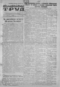 1 Пролетарии всех стран, с о е д и н я й т е ^ ^Й М * 4 £ & П и # Н 6Ш Оргян Ка р а е ) к с к о г о райкома ВКП(б) и районного' ' Совета д еп ут а т ов трудящихся, Но в о с и б и р с к о й оСдости. № 7 8 ( 1 0 9 2 ) 30 Четверг, о к т я б р я 1 9 4 7 r e f f ? Цена н о м е р а 1,5 к о п е е к За достойную встречу 30-летия Октября! Близится знаменательный день — 30-л етие Великой Октябрьской Социалисти ческой революции. Т р у ж е ники социалистических по лей многих областей , к р а ев и республик встречают революционный праздник досрочным выполнением и перевыполнением плана хлебозаготовок. Вступая в поход за высокий у р ож ай нынешнего года, хл еборобы нашего района брали на себя по- гтное обя за тел ь ство : д о с р о ч н о выполнить план х л е босдачи государству. Партия, Род и н а , то в а р ищ Сталин ждут от нас ч е с т ного выполнения взятых обязательств . Колхозники передовых артелей, не забывая о своей первейшей заповеди, у с п е ш н о выполнили свой долг перед Родиной. Колхозы «Вперед к коммунизму», «18 лет О к т я б р я 1, совхозы имени Д з е р ж и н ского и «Октябрь» д о с р о ч но рассчитались с го с у д а р -j ством по хлебопоставкам и продолжают сдачу хлеба сверх плана. Накануне з а вершения плана х л е б о з а готовок сельхо зартели „Пушник Сибири1, „Веселый т р у д 1, имени Андреева и некоторые другие . Однако, наш район в целом находится в большом долгу перед гос ударс твом . К 25 октября годовой план хлебозаготовок всего лишь на 70,3 проц. Особенно провальное по л о жение создалось в к о л х о зах Кучугурского, Троицкого и Осолодинского с ел ь советов. Руководители партийных организаций и п р ед седатели ко л х о з о в , у к а з а н ных сельсоветов, встали на вредный путь свертывания хлебозаготовок, оп р авды ваясь отсутствием хлеба. Однако причины не в этом, дело в том, что р у к о водители к о л х о з о в К у чу г у р ского, Троицкоги и О с о ло динского с е л ь с о в е т о в не Все чув ствую т серьезной т р е в о ги за с удьбу х л е б о з а г о т о вок , потеряли правильную линию в этом вопросе, не мобилизовали колхозников на упорный т р у д за б е з у с ловное выполнение плана сдачи хлеба го сударству. Причины срыва плана хлебосдачи кроются ещ ё и в том, что в некоторых кол х о з а х зерно задерживается под видом «отходов». Т а кая порочная практика имеет место в к о л хо зах „Новая жизнь" (председатель тов. Артемов), «Коминтерн» (п р е д се д ат ел ь тов. Д ь я ч е н ко), имени Ж данов а (предс е д а т е л ь тов. Сидоренко) и некоторых д р у г и х j И нтересы общ его дела требуют немедленной сда чи го сударству всего зерна, имеющеТбс'я в колхо зах . Р е ч ь идет о том, чтобы все отходы были очищены и полученное зе рно отправлено на заготовительные пункты. Р е ч ь идет о том, чтобы партийные организации и председатели сел ьсо ветов строго пресекали всякие попытки незаконного расходования хлеба в кол х о зах . Р е ч ь идет, наконец, о том, чтобы каждый к о л х о з принял все нео б х о димые меры для полного и бе зус ловн о го вьшо т е н и я обязательств но сдаче х л е ба гос ударс тву . С 25 октября по 5 ноября о б 'явл ен а предоктябрь- в ы п о л н е н |с к а я де ка да завершения х л е бо за готовок и сверхпла новой сдачи хлеба г о с у дарству . Прямой долг р у ководителей партийных и советских организаций, пред сед а те лей колхозов и всех труж ен иков к о лхо зной д е ревни организованно провести де ка д у . Встретим 30-ю годовщи ну сов етской власти новыми победами на фр