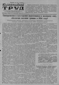 Пролетарии всех стран, соединяйтесь! КЬиЛекипиСннй Т Р У Д ОРГАН КАРАСУКСКОГО РАЙКОМА КОММУНИСТИЧЕСКОЙ ПАРТИИ СОВЕТСКОГО СОЮЗА И РАЙОННОГО СОВЕТА ДЕПУТАТОВ ТРУДЯЩИХСЯ, НОВОСИБИРСКОЙ ОБЛАСТИ № 95 (1728) | Четверг, 26 ноября 1953 г. | Цена 10 к. Товарищи механизаторы, инженеры, техники, специалисты сельского хозяйства! По примеру лушниковцев включайтесь в социалистическое соревнование за своевременную и всестороннюю подготовку к севу 1954 года. Направим все свои усилия на успешное претворение в жизнь исторического постановления сентябрьского Пленума Центрального Комитета Коммунистической партии Советского Союза! Своевременно и всесторонне подготовимся к весеннему севу, обеспечим высокие урожаи в 1954 году! Обязательства рабочих, инженерно-технических работников и специалистов сельского хозяйства Лушниковской МТС, Сузунекого района С чувством глубокого удовлетворения и радости воспринял коллектив нашей станции постановление сентябрьского Пленума ЦК КПСС «0 мерах дальнейшего развития сельского хозяйства СССР». Мы хорошо понимаем, что дальнейший крутой подъём всех отраслей колхозного производства зависит прежде всего от работы машинно-тракторных станций. В текущем году коллектив нашей МТС добился некоторого улучшения работы станции. Годовой план тракторных ра- бот мы выполнили на 102 процента, улучшили использование машинно-тракторного па-р ' а, выработав на каждый 15- енльный трактор в среднем по 1)40 гектаров мягкой пахоты, снизили себестоимость обработки одного гектара мягкой пахотына 3руб. 35 коп. в сравнении с плановой и полностью подготовили землю под посев будущего года во всех пяти обслуживаемых колхозах. Тракторная бригада инициатора областного соревнования бригадиров тракторных бригад т. Ширяева выполнила план тракторных работ на 110 процентов, выработала на каждый 15-снльный трактор по 745 гектаров мягкой пахоты, обеспечила получение урожая зерновых культур в среднем по 13 центнеров с гектара. Бригада т. Волобуева выработала на 15-сильный трактор 735 гоктаров, обеспечила получение урожая в среднем по 12,8 Центнера с гектара. Комбайнер т. Попов в колхозе «Пламя» сцепом двух комбайнов «С 6» намолотил 9.846 центнеров зерна. Комбайнер т. Поминов комбайном «С-6» убрал 522 гектара. Трактористы тт. Печенкпна, Третьяков, Железнов, Антропов, Тверикин п ряд других добились высокой выработки на трактор при значительной экономии горючего Однако в работе нашей МТС имеются ещё серьёзные недостатки. В текущем году мыне достигли плановой урожайности зерновых культур в обслуживаемых колхозах, мало сеем многолетних трав, не освоили севообороты. Допускались простои техники. Резервы новы шенпя производительности тракторов псельскохозяйственных машин использованы ещё далеко не полностью. Считая, что практическое выполнение задач, поставленных сентябрьским Пленумом ЦК КПСС, будет во многом зависеть от своевременной и всесторонней подготовки МТС и колхозом к весеннему севу 1954 года и проведения зимних агротехнических мероприятий, направленных на повышение урожайности всех сельскохозяйственных культур, коллектив рабочих, инженерно-технических работников и специалистов сельского хозяйства Лушниковской МТС, вступивв социалистическое соревнование за дальнейший подъём сельского хозяйства, принимает на себя следующие о б я з а т е л ь с т в а : 1