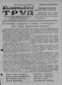 и Пролетари всех стран, соединяйтесь! 1СЬиЛе4гпш£м1й ОРГАН FAPA< 5КСКОГО. РАЙКОМА FOKH5РИСТИЧЕСБОЛ ПАРТИИ СОВККЬ'ОГО СОЮЗА И РАЙОННОЮ СОВЕТА 1ЕПУ1АТОВ ТРУДЯЩИХСЯ, НОВОСИБИРСКОЙ ОБЛАСТИ jife 1 Понедельник, 27 сентября 1954 г, СПЕЦИЯЛЬНЫЙ ВЫПУСК • Товарищи колхозники, рабочие МТС и совхозов! Приложим все усилия к выполнению плана уборки и х л е б о з а г о т о в о к к 1 октября ! В сентябре завершить уборку и хлебосдачу дело чести тружеников района! Славно потрудились колхозники и механизаторы в минувшую пятидневку. Прирост по району на хлебоуборке составил 18,2 процента, а на хлебозаготовках — 19,9 процента. Колхозы им. Куйбышева, «Пятилетка», «Вперед к коммунизму», им. Амангельды выполнили план обязательных поставок п закупок хлеба государству и рассчитались по натуроплате за работы МТС по предъявленным счетам. Все колхозы Октябрьской МТС уже выполнили план уборки зерновых, завершили косовпцу колосовых колхозы «Вперед к коммунизму», им. Амангельды, заканчивает уборку хлебов в колхозах своей зоны Стуленовская МТС. Однако мы никак не можем успокаиваться достигнутыми результатами. В целом по району ещо стоит на корню около 8 тысяч гектаров пшеницы, мы выполнили план хл! бозаготовок только на 87,3 процента. Эти цифры слишком неутешительны. Нас обогнал по хлебозаготовкам соседний район Кулупды Чпсгиозер- ш й , а по уборке зерновых— Купинский и Андреевский. В областном соревновании районов по хлебозаготовкам мы занимаем только пятсе место. Все это говорит за то, что в районе не создано высокого трудового напряжения на полях и токах, партийные п хозяйственные руководители не прониклись чув-твом ответственности за судьбу урожая и досрочное выполнение плана хлебозаготовок. Не с максимальной нагрузкой используется .комбайновый парк. Самой высокой ежечневной выработки на каждый комбайн добилась Октябрьская МТС— 16,0 гектара, в остальных л;е МТС гораздо ниже. Однако и эта выработка далеко не предел. Передовые МТС области ее довели до 20 гектароа. Значит, мы нс используем все пМ’ юп неся > нас резервы. А эти резервы— в рргаипзацьи ьри ..о< уточтй работы комбайнов, в ликвидации пресгоев из-за разгрузки и по органнза- цпонным п техническим неполадкам. Наступал |ешающий этап \боркн и хлебосдачи. Наш район имеет все возможности завершить косовицу хлебов и выполнить план хлебозаготовок в сентябре. К этому нас обязывают ранее взятые социалистические обязательства, в этом заключается нага патриотический долг перед партией и государством. Руководители колхозов, МТС и совхозов, партийные и комсомольские организации должны мобилизовать на выполнение этой задачи все силы и сродства. Прежде всего необходимо добиться, чтобы каждый комбайн работал не менее 20 часов в сутки, чтобы все члены агрегата считали своим долгом выполнять не менее двух норм в сутки. ' Товарищи колхозники и горожане, прибывшие на уборку в колхозы! Организуй го круглосуточную высокопроизводительную работу на таках и сушилках, немедленно очищайте все зерно, поступающее от комбайнов, п направляйте его на заготовительные пункты! Долг водителей автотранспорта— бороться за ускорение оборачиваемости машин, днем и ночью транспортировать зерно на государственные пункты, организовать непрерывный поток хлеба в закрома любимой Родины! Малейшую задержку с погрузкой на току и выгрузкой его на пункте «З