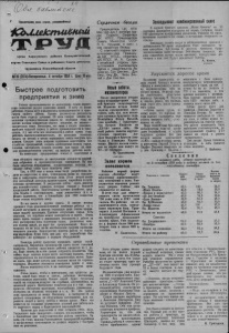 2 КОЛЛЕКТИВНЫЙ ТРУД 4 октября 1959 года, № 119 Сипу-штуп i теплул знплвку С четвертой сессии районного Coeemaldenymamoe трудящихся 29 сентября в районном Доме культуры состоялась четвертая сессия районного Совета депутатов грудящихся седьмого созыва, которая рассмотрела вопрос о подготовке и проведении зимовки скота в колхозе 440лет Октября».Был обсужден доклад председателя арте ли т.Лопина и содоклады председателей Хорошинского и Калиновского сельских Советов тт. Омельченко и Гребенника На 1 сентября в хозяйстве содержалось около 5 тысяч голов крупного рогатого скота, из них 1394 коровы, около 10 тысяч овец, ИЗО свиней и более 12.650 голов птицы. Годовой план по поголовью крупного рогатого скота выполнен на 109 процентов, по овцам на 111, а по птице в полтора раза. Однако колхоз медленно и плохо готовится к проведению зимовки скота. Мало заготовлено грубых и сочных кормов, На каждую условную голову приходится грубых кормов по 7,8 центнера, в т. ч. сева по 6,5; заложено силоса в расчете на корову и нетель по 7,3 тонвы. Несмотря на низкую обеспеченность кормами, дополнительная заготовка сена и скирдование соломы идет медленно. Корма в основном находятся в поле, подвозка их не организована. Для размещения животвых было начато строительство 19 животноводческих помещений. Большинство из них еще неготово, и мало надежды, что они будут подготовлены к началу зимы. Но даже при условии, что все дворы будут выстроены, то и тогда помещений не хватит на все поголовье. Особенно плохо с помещениями в бригаде № 13, где совершенно негде зимовать дойному гурту. В бригаде № 1, за исключением свинарника, помещения не готовы. В бригаде № 9 телятник i e вместит всех народившихся телят. В полуразваленном состоянии находится коровник в бригаде № 12. Правление колхоза,'' бригадиры комплексных бригад, сельские Советы неудовлетворительно решают вопросы организации водопоев скота: не хватает колодцев, не изготавливаются корыта, не расчищаются подходы к естественным водопоям. Не принимается мер к обеспечению животных водой непосредственно в помещениях. Крайне плохо решаются вопросы механизации трудоем- £их работ в животноводстве и юдготовки кормов к скармли- шнию. Отсутствуют подвесные (ороги в помещениях, не вне- фяется механическая дойка, штопоенве, не на всех фермах [меется электроосвещение. Не щдется ремонт и строительство кормокухонь, имеющиеся юрмозапарншш разкомплекто* ваны и разбросаны по усадьбам бригад. Запущена на фермах племенная работа,не производится отбор высокопродуктивных животных, не комплектуются фермы племенных телочек. По- настоящему не налажен и зоотехнический учёт, плохо внедряется искусственное осеменение животных. Зооветспе- циалисты самоустраняются от решения этих вопросов. В ряде бригад на фермах имеет место большая текучесть кадров, недобросовестное отношение отдельных доярок, пастухов и других работников к своим обязанностям. Слабо проводится воспитательная работа с людьми, итоги соревнования подводятся от случая к случаю, опыт передовиков не делается достоянием всего коллектива, не всегда поощ ряются лучшие производствен' ники. f i a u i т и ш /т Не таним должен быть комсомольский вожак Ораться: молочно-коисервный комбинат ссылается на сель- хозснаб, а он тоже отказывается. На охрану кормов и животноводческих помещений от пожаров обратил внимание 