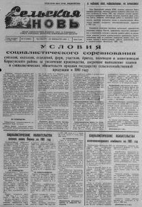ПРОЛЕТАРИИ ВСЕХ СТРАН, СОЕДИНЯЙТЕСЬ! В РАЙКОМЕ КПСС, райисполкоме , рк профсоюза ОРГАН КАРАСУКСКОГО РАЙКОМА КПСС И РАЙОННОГО СОВЕТА НАРОДНЫХ ДЕПУТАТОВ НОВОСИБИРСКОЙ ОБЛАСТИ Газета основана 2 октября 1930 г. № 12 (59G2) ЧЕТВЕРГ, 29 ЯНВАРЯ 1981 г. Цена 2 коп. - / - I Бюро Карасукского райкома КПСС, исполком районного Совета народных депутатов, президиум райкома профсоюза работников сель ского хозяйства 23 января 1981 года утвердили условия социали стического соревнования совхозов, колхозов, отделений, ферм, участ. ков, бригад, полеводов, животноводов района за увеличение произ водства, досрочное выполнение планов и социалистических обяза тельств продажи государству сельскохозяйственной продукции в 1981 году. Предложено секретарям партийных организаций, председателям исполкомов сельских Советов, профсоюзных комитетов, руководите лям и специалистам колхозов и совхозов провести работу по разъяс нению районных условий социалистического соревнования, принять необходимые меры по успешному завершению зимовки скота, под готовки техники к весенне-полевым работам, выполнению планов и социалистических обязательств 1981 года. 'У с л о в и я социалистического соревнования совхозов, колхозов, отделений, ферм, участков, бригад, полеводов и животноводов Карасукского района за увеличение производства, досрочное выполнение планов и социалистических обязательств продажи государству сельскохозяйственной продукции в 1981 году I Труженики сельского хозяйства рай она, как и весь советский народ, с чув ством глубокого удовлетворения воспри няли проект ЦК КПСС к XXVI съезду партии «Основные направления эко номического и социального развития СССР на 1981 — 1985 годы и на период до 1990 года». Стремясь внести достойный вклад в выполнение планов первого го да одиннадцатой пятилетки, включив шись в социалистическое соревнование за достойную встречу XXVI съезда КПСС и претворение в жизнь его решений, они приняли высокие социалистические обя зательства на 1981 год и полны реши мости их с честью выполнить. С целью повышения творческой ак тивности и трудового энтузиазма в вы полнении государственных планов и со циалистических обязательств по произ водству и продаже сельскохозяйственной продукции бюро РК КПСС, исполком районного Совета народных депутатов, президиум райкома профсоюза работни ков сельского хозяйства объявляют сле дующие условия социалистического со ревнования: ПО ПОЛЕВОДСТВУ Победителями социалистического со ревнования будут признаны: Совхоз, колхоз, получивший наивыс ший урожай сельскохозяйственных куль- емаееевеееоееее в :еое а оеаееоаааеееа о ее о 1 тур, но не менее 16 ц зерновых с гек тара, кукурузы не менее 150 ц, выпол нивший народнохозяйственный план и социалистические обязательства по про даже зерна государству, план засыпки семян, имеющий наивысшую кор- мообеспеченность, но не менее 20 ц кормовых единиц на условную голову скота, в лучшие агротехнические сроки подготовивший почву под урожай буду щего года. Совхозу, колхозу присуждается пере ходящее Красное знамя, хозяйство на граждается Почетной грамотой бюро райкома КПСС, исполкома районного Совета народных депутатов, президиума райкома профсоюза работников сельско го хозяйств..-, заносится на районную дос ку Почета, ему присваивается звание «Хо зяйство высокой культуры земледелия», вручается