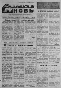 ПРОЛЕТАРИИ ВСЕХ СТРАН, СОЕДИНЯЙТЕСЬ! ОРГАН КАРАСУКСКОГО РАЙКОМА КПСС И РАЙОННОГО СОВЕТА НАРОДНЫХ ДЕПУТАТОВ НОВОСИБИРСКОЙ ОБЛАСТИ В ОТВЕТ НА ВЫСОКУЮ НАГРАДУ Газета основана 2 октября 1930 г. Взяли высокие обязательства Вступая в завершающий год десятой пятилетки, я брала обя зательство закупить в 1980 году по 800 кг молока на коро ву, имеющуюся в личном поль зовании граждан села. С обяза тельством успешно справилась, закупила по 814 кг на корову. Задание 1980 года по заготовкам молока у населения выполнила на 273,3 процента. План деся той пятилетки также успешно выполнила, за пять лет закупила на каждую корову личного поль зования граждан по 3472 кг. В этом мне большую помощь оказали депутаты сельского Со вета. Хорошо работает по сбору молока у населения сборщик 0. Я. Шевердина. Я, как сепара торщик, всегда нахожусь в тес ном контакте со сдатчиками, ре- Рейд „Сельской нови “ и народного контроля В кругу неурядиц Калиновский совхоз в завер шающем году десятой пятилетки получил самый низкий в районе урожай зерновых культур и не справился с планом хлебосдачи. Не лучшим образом сработали и кормопроизводители. Причин тому немало. В первую очередь это низкая культура земледе лия, неорганизованность в про ведении предшествующего стра де комплекса технических меро. приятий, дефицит механизатор ских кадров. Говорят, на ошибках учатся. К сожалению, калиновцы не сде лали должных выводов из по следнего урока. Это подтверди ли результаты проверки по под готовке хозяйства к очередно му полевому сезону. К концу минувшей недели сне гозадержание в совхозе было выполнено на 4806 гектара/, что меньше 40 процентов к площади пашни. К проведению ответст венного агроприема здесь подо шли крайне неорганизованно. Ежедневно в течение декабря и января на поля выходило не бо. лее 4 — 5 агрегатов со снегопа хами. Работали они большей частью на полях центральной фермы, где снежные валы наре заны на 2398 га, На остальных фермах эти показатели значи тельно ниже. К примеру, на Не- стеровской — 950 га, на Озерян- ской — 1009 га, на Грамотинской — 449 га. А до полей и осталь ных угодий третьей фермы (с. Свободный Труд) агрегаты со снегопахами еще не добрались до сих пор, и здесь зимние осад ки не задержаны ни на одном гектаре! К сказанному следует добавить и такой факт: снего задержание в хозяйстве в тече ние последних двух недель не ведется вообще. На вопрос, в чем причина та кой нерасторопности, главный агроном совхоза В. П. Нагорный развел руками: нет людей, нет Техники. №18(5968) ЧЕТВЕРГ, 12 ФЕВРАЛЯ 1981 г. гулярно произвожу расчет за молоко, проданное государству. В зимнее время широко исполь зую фляжный метод заготовок путем выдачи фляг сдатчикам для сбора и замораживания молока на дому. В нашем селе более 140 хозяйств, имеющих коров, поч ти все они продают молоко го сударству. В 1980 году молоко- сдатчики В. П. Гаврилец из сво его хозяйства продал 4900 кг молока, К. К. Бахтина — 2900, В. Я. Попов — 2500 кг, Р. А. Шнайдер — 3000 кг, С. И. Буд ко — 3900 кг. Еще больше воодушевляет каждого труженика проект ЦК КПСС «Основные направления экономического и социального развития СССР на 1981 — 1985 годы и на период до 1990 года». Тракторов в хозяйстве хватает, есть среди них и девять могучих «Кировцев». Но на день проверки исправными оказались лишь пять. Четыре из них заняты в животно водстве на подвозке кормов, а один стоит без дела, пос