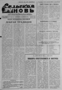 Решения XXV/ съезда КПСС — выполним\ ПРОЛЕТАРИИ ВСЕХ СТРАН, СОЕДИНЯЙТЕСЬ ! ОРГАН КАРАСУКСКОГО РАЙКОМА КПСС И РАЙОННОГО СОВЕТА НАРОДНЫХ ДЕПУТАТОВ НОВОСИБИРСКОЙ ОБЛАСТИ Газета основана 2 октября 1930 г. № 71 (6021) ВТОРНИК, 16 ИЮНЯ 1981 Г. Цена 2 кои. ИДЕТ ПРОВЕРКА. ПОСЕВОВ СВЕРХ ПЛАНА-800 ц МОЛОКА Успешно работают нынче по производству молока животно воды колхоза «Маяк Ильича». В сравнении с прошлым годом они сделали значительный шаг впе ред. Так, за пять месяцев надой па корову составил 908 кило граммов, что больше аналогич ного прошлогоднего показателя на 206 кг. Выше нынче и су точные надои. В конце минувшей недели хо зяйство досрочно справилось с шестимесячным планом продажи государству молока. На при емные пункты его отправлено 6200 центнеров, причем свыше 98 процентов первым сортом. Особой похвалы заслуживают ,жи волноводы Кавкуйской бригады, где радой от коровы доведен до 847 кг. Среди доярок впереди идут 9. Ф. Шефер, 11. 11. Ткалун, Е. 11. Татьянич, 3. X. Хабибули на, В. Попадюк. Взвесив свои возможности, труженики колхоза решили до конца июня сверх годового пла на отправить государству еще 800 ц молока. Е. БЕНДЕР, председатель колхоза. ДОБРАЯ ТРАДИЦИЯ Вот уже восемнадцать лет, следуя доброй традиции, сорев нуются меж собой за наивыс шую производительность труда в сельскохозяйственном произ водстве колхозы «Новая семья» и «Маяк Ильича». Как всегда в соревновании кто-то выходит вперед. Победителем в этом со перничестве за последние годы является «Новая семья». Тру довое соперничество не является формальным, свидетельством че го служат регулярные поездки делегаций хозяйств в целях вза имопроверки работы и результа тов друг друга. На этот раз к полеводам «Ма яка Ильича» первыми прибыли полеводы «Новой семьи». Цель приезда — проверка качества ра бот во время посевной кампании, иначе говоря, всходов. В прове ряемом хозяйстве зерновые раз мещены на площади 4870 га, главная продовольственная куль тура ■ пшеница — на 4325 га. Проверяющие скрупулезно, с профессиональной точки зрения, осмотрели поля. Гости похвалили работу хозяев на основном зер новом клине. Однако указали на некоторые недостатки. Кое-где всходы были редки, местами виднелись черные пятна. Для того, чтобы убедиться в правильной технологической ра боте, гости проверили густоту всходов. Оказалось, что на од ном гектаре она соста вила 2 млн. вместо планируе мых 3,5. Норма высева состав ляет 131 кг. В итоге .получает ся, что потеряны 50 кг зерна. По мнению чернокурьинских хлебо робов это — большое расточи тельство. Отдельные поля, как отмечалось, недостаточно выров нены. А это в известной степени отрицательно сказывается па ка честве сева и, в конечном счете, на урожае. Хозяева поделились своим опытом работы на полях. В ре зультате выяснилось, что в кол хозе «Маяк Ильича» предпосев ная обработка на зерновом кли не практически не велась. Посо вещавшись, взвесив все «за» и «против» хлеборобы из «Новой семьи» дали очень хороший со вет. Поля «Маяка Ильича» — \ ИЗВЕЩЕНИЕ \ 25 июня 1981 года в 2 часа дня в Доме Советов созывается { очередная сессия Карасукского городского Совета народных де- \ . путатов с повесткой дня: * * к ) 1 «0 дальнейшем развитии и совершенствовании народного образования в городе в свете решений XXVI съезда КПСС». До кладчик — заведующий районе т. Ткач А. Ф. Приглашаются депутаты районного и областного ^¿$ето