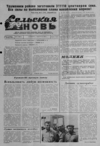 Труженики района заготовили 311110 центнеров сена. Все силы на выполнение плана накопления кормов! В РК КПСС, райисполкоме, РК профсоюза ПРОЛЕТАРИИ 8СЕХ СТРАН. СОЕДИНЯЙТЕСЬ! ОРГАН КАРАСУКСКОГО РАЙКОМА КПСС И РАЙОННОГО СОВЕТА НАРОДНЫХ ДЕПУТАТОВ НОВОСИБИРСКОЙ ОБЛАСТИ Газета основана ? лг» qi ¿fin41 Т 2 октября 1930 г. £2 СУББОТА, 1 АВГУСТА 1981 г. Цена 2 коп. Председателю колхоза «Новая семья» т. БАРАННИКОВУ А. С. Секретарю партийной организации т. УКОЛОВУ В. А. Председателю профкома т. Районный комитет партии и райисполком горя чо поздравляют тружеников колхоза «Новая се мья» с замечательной победой. Претворяя в жизнь решения XXVI съезда КПСС по дальней шему подъему сельскохозяйственного производ ства, коллектив хозяйства активно включился в социалистическое соревнование по созданию проч ной кормовой базы общественному животновод ству на период предстоящей зимовки. Как извест но, чернокурьинны раньше других в районе спра вились с планами заготовки сенажа в объеме 13 тыс. ц и витаминной травяной муки, выработав ее 5536 ц при плане 2700 ц. А 29 июля колхоз первым в районе рапортовал о выполнении плана сенозаготовок — в стога поставлено 27 тыс. ц доброкачественного сена. Сложным погодным условиям в ходе зеленой жатвы кормозаготовители колхоза противопоста вили четкую организацию труда, основанную на передовых приемах — применении отрядного мето да, высокое профессиональное мастерство каждо го участника этой ответственной кампании. Право фланговыми социалистического соревнования яв ляются косари Л. С. Кошман, А. В. Рощепко, В. К. ТЕРЕХОВУ А. И. Колесников, М. М. Храпко, грабельщики Н. П. За- чиняев, И. А. Дудко, С. Н. Потапов, скирдовщики А. М. Морковский, В. И. Лобачев, И. А. Телепнев, механизатор на транспортировке сена А. П. Сквор цов, звенья по выработке витаминной травяной муки, возглавляемые Н. Д. Атикеевым и А. А. Дилем. Труженики хозяйства поставили перед собой за дачу заготовить не менее 40 тыс. ц сена, 7 тыс. ц витаминной травяной муки, выполнить планы на копления силоса и соломы и запасти таким обра зом в зимовку на каждое животное по 25 центне ров кормовых единиц. Райком КПСС и райисполком выражают уве ренность, что труженики колхоза в сжатые.сроки и без потерь проведут уборку урожая, организован но вступят в зимовку скота, тем самым добьются дальнейшего повышения продуктивности обще ственного стада и успешно Справятся со всеми обязательствами и планами по производству сель хозпродуктов в первом году одиннадцатой пяти летки. - РАЙКОМ КПСС "РАЙИСПОЛКОМ ОБ ИТОГАХ ВЫПОЛНЕНИЯ ЗАДАНИЯ ДЕКАД НИКА КОЛХОЗАМИ И СОВХОЗАМИ РАЙОНА НА ЗАГОТОВКЕ КОРМОВ Бюро райкома КПСС, исполком районного Совета народных де путатов, райком профсоюза работников сельского хозяйства подвели итоги выполнения задания декадника с 21 июля по 31 июля на за готовке кормов колхозами и совхозами района. В постановлении от мечается, что большинство хозяйств организованно вели заготовку кормов, обеспечили выполнение задания декадника районом. Победителем соревнования по выполнению задания декадника на заготовке кормов среди совхозов признан Калиновский совхоз, вы полнивший задание декадника на 137,9 проц. Заготовил за десять дней 9656 центнеров сена. Среди колхозов победителем соревнования признан колхоз име ни Куйбышева, выполнивший задание на 106,9 проц. Заготовил за десять дней 64¡6 центнеров 