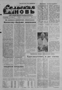 П РОЛЕТАРИИ ВСЕХ СТРАН, СОЕДИНЯЙТЕСЬ! ОРГАН КАРАСУКСКОГО РАЙКОМА КПСС И РАЙОННОГО СОВЕТА НАРОДНЫХ ДЕПУТАТОВ НОВОСИБИРСКОЙ ОБЛАСТИ Дневник сельхозработ Газета основана 2 октября 1930 г. № 92 (6042) ВТОРНИК, 4 АВГУСТА 1981 г. Цена 2 коп. На контроле — выполнение обязательств Качеству — больше внимания По данным оперативной свод ки райсельхозуправления, тра вы в районе скошены на 55716 гектарах. Сена на- скирдовано 330816 центнеров, что составляет 73 процен та к годовому плану. При бавка на стоговании за пос ледние три дня составила 19706 центнеров. Самой высокой она оказалась в совхозах им. Дзер жинского — 2266 ц, Студенов- ском — 2191 ц, Калиновском — 2081 ц, в колхозах им. Тельма на — 1697 ц, им. Куйбышева — 1584 ц, им. Мичурина — 1014 ц. Однако в отдельных хозяйст вах темпы скирдования несколь ко упали. Колхоз «Новая семья», сов хозы «Октябрь» и Хорошинский продолжают производство ви таминной травяной муки. В це лом этого корма выработано 9607 ц. Сенажа запасено 22041 ц. Веточного корма заготовлено 3659 ц. При заготовке веток необходимо обращать внимание на их качество. Это требование кое-где нарушается. Продолжаются работы на па ровых полях, идет их рыхление, сев кулис. В общем по району кулисы размещены на 13933 га. Восемь хозяйств ведут уборку зерновых культур. Они скоше ны на 390 гектарах и обмоло чены на 185 га. Механизаторы, выше темпы заготовки кормов и уборки уро жая. Максимально используйте для этого технику и время! Лето нынче выдалось сухим и жарким, что принесло животно водам нашего района дополни тельные трудности. Но и в этих нелегких условиях большинство колхозов и совхозов производят и продают государству молоко высоких кондиций. За первое по лугодие хозяйства отгрузили на молкомбинат 96,2 процента мо лока первым сортом. А совхозы Калачинский и мясной, колхоз имени Тельмана продавали толь ко первосортную продукцию. Это хорошие показатели. Но вот дру гие — плодово-ягодный совхоз, колхозы «Вперед к коммунизму», им. Жданова, им. Калинина про извели первосортного молока только по 78,7 — 86,3 проц. Из приведенных данных мож но сделать соответствующий вы вод: в одинаковых условиях одни работают хорошо, другие зна чительно хуже. Это положение объясняется разницей в подходе к делу. Как показала проверка, причинами низкого качества мо лока являются не только жаркая погода, хотя и она отрицательно сказывается, но и слабый кон троль некоторых руководителей и зооветспециалистов за работой доярок и скотников по выполне нию прямых обязанностей. Вот некоторые примеры. При проверке Кавкуйской брига, ды колхоза «Маяк Ильича» ус тановлено, что молоко с фермы вывозится без оформления соп роводительной документации. Мо лочный танк, в который после дойки сливается молоко, моется только через сутки, да и то од ной холодной водой. В день про верки были обнаружены остатки Поздравляем с наградами! За достигнутые успехи в вы полнении заданий десятой пяти летки по развитию народного здравоохранения и медицинской науки Президиум Верховного Со', вета СССР Указом от 26 нюня 1981 года наградил: Орденом Трудового Красного Знамени БОРОДИНА Алексея ПОБЕДИТЕЛИ Закончился конкурс штукату ров, проводимый на строитель ной площадке шестидесятиквар тирного жилого дома, возводимого коллективом строительно-монтаж ного поезда № 710 отделе ния дороги. Среди звеньев пер- ■ вое место присуждено предста ви