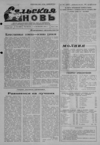 ПРО ЛЕТАРИИ ВСЕХ СТРАН, СОЕД ИНЯ ЙТЕСЬ ! ОРГАН КАРАСУКСКОГО РАЙКОМА КПСС И РАЙОННОГО СОВЕТА НАРОДНЫХ ДЕПУТАТОВ НОВОСИБИРСКОЙ ОБЛАСТИ Газета основана ’ до 105 (6055) 2 октября 1930 г. | ' ' ЧЕТВЕРГ, 3 СЕНТЯБРЯ 1981 г. Цена 2 коп. Передовая специалиста Качественные семена — основа урожая Много труда, умения и настойчивости было вложено тружениками района для получения вы сокого урожая в текущем году. Но жестокая за суха заметно снизила урожай всех культур. Одна ко возросший уровень агротехники позволил и в этих условиях получить отдачу гектара в 2 — 3 раза выше, чем в прошедшие аналогичные годы. Урожай зерновых культур по району составляет сейчас около 4,5 ц с га, а в колхозах «Новая се мья» — 7,8, им. Карла Маркса — 6,4, им. Ле нина — 6 ц с га. Общепризнано, что основным фактором, от ко торого зависит засухоустойчивость посевов, яв ляется качество семян. Семена районированных сортов с высокими посевными свойствами дают дружные всходы, развивают мощную корневую систему, что и определяет величину урожая. В со четании с другими передовыми агротехническими приемами, такими как размещение по лучшим предшественникам, применение органических и минеральных удобрений, зональная система обра ботки почвы и др., урожай в любой по клима тическим условиям год получается сравнительно высоким. И в этом году имеется много примеров, когда посевы высших репродукций по паровым полям дают по 12 — 14 ц зерна с гектара. В условиях текущего года перед агрономами колхозов и совхозов, машинистами поточных ли ний стоит ответственная задача обеспечить засып ку семенных фондов в количестве 16290 тонн, и не только по количеству, а и высоких посевных кондиций. По состоянию на 1 сентября в районе засыпано 6427 тонн семян, что составляет 39,4 проц, к плану. Лучше других эту работу ведут Студеновский совхоз, колхозы «Маяк Ильича», им. Куйбышева, «Новая семья», им. Карла Марк са (агрономы-семеноводы т.т. Трифонов Ю. Н., Кооп Л. И., Айснер В. А., Уколов С. П., Куря- ченко М. М.). Однако проверка подготовки семян показывает, что в целом ряде хозяйств этому важному во просу уделяется крайне недостаточное внимание. При наличии мощных семяочистительных комплек сов, незначительном поступлении зерна от ком байнов не обеспечивают доведение семян до вы соких посевных кондиций в совхозах им. Дзержин ского, Хорошинском, Калиновском, в колхозах им. Тельмана, им. Жданова и других. Во многих хозяйствах несвоевременно и нека чественно отремонтирована зерноочистительная техника. Все это приводит к накоплению зерна на токах, засыпке некондиционных семян в скла ды на хранение. Многие агрономы, машинисты по точных линий не владеют в совершенстве регули ровками, в результате чего зерно пропускают че рез очистительные машины 2 — 3 раза, травмиру ют семена и не добиваются нужного эффекта. Для работников токов задача состоит в том, чтобы одновременно с окончанием уборочных ра бот выполнить планы засыпки семян. Главным агрономам, главным экономистам хозяйств следу ет ознакомить всех рабочих, которые заняты на сортировке семян, с мерами материальной заин тересованности за доведение семян до 1 — 11 клас сов посевного стандарта. Повторяются ошибки с доведением до посев ных кондиций семян многолетних и мелкосемян- ных однолетних трав. Сейчас, в сухую погоду простаивает семяочистительпый комплекс КОС-0,5 в колхозе «Новая семь
