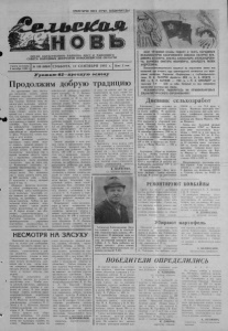ПРОЛЕТАРИИ ВСЕХ СТРАН, СОЕ Д ИНЯЙТЕСЬ ! ОРГАН КАРАСУКСКОГО РАЙКОМА КПСС И РАЙОННОГО СОВЕТА НАРОДНЫХ ДЕПУТАТОВ НОВОСИБИРСКОЙ ОБЛАСТИ Газета основана 2 октября 1930 г. Продолжим добрую На протяжении двух послед них пятилеток колхоз имени Тельмана получает устойчивые урожаи всех сельскохозяйствен ных культур. Залогом тому яв ляется рост культуры земледе лия, в том числе улучшение ра боты с зябью. Хозяйство еже годно готовит землю под весь яровой сев с начала осени, при чем, как правило, значительную часть зяби составляет ранняя — августовская и первой половины сентября. При подготовке поч вы используется широкий на бор орудий, применяющихся в зависимости от обрабатываемо го фона. Результаты такого под хода к делу налицо. Нынче полеводы хозяйства поставили перед собой зада чу создать урожаю второго го да одиннадцатой пятилетки на дежную основу. К взмету зяби благодатны приступили еще в первой половине августа, начав его с перепашки участков, ос вободившихся после .косовицы однолетних трав на корм ско ту. Количество пахотных аг регатов увеличивалось по мере расширения выходящих из уборки полей. Это позволило уже к концу августа иметь око ло 800 гектаров зяби — • более 25 процентов к плану, который равен 3 тыс. га. Широким фронтом подготов ка земли развернулась с нача ла с.ентября, когда освободилось сразу несколько тракторов, ра нее занятых на уборке силосных культур, на трамбовке зеленой массы кукурузы. Сейчас на вы полнении этого важного агро приема занято около десяти машин, разделенных на три зве на. В первое входят два «Ки ровца», сагрегатированных с глубокорыхлителями КПГ-2-150. Могучими машинами высоко производительно управляют опытнейшие механизаторы, не однократно входившие в число НЕСМОТРЯ Нынешний год оказался слож ным не только для хлеборобов. Немалые трудности принес он и коллективу плодово-ягодного совхоза, единственного в рай- оне хозяйства, занимающегося производством плодов и ягод. Нежелательные сюрпризы при рода начала преподносить садо водам еще в мае, когда позд ние заморозки существенно по вредили обильно цветущие план тации, в первую очередь смо родину. Нелегким испытанием для садоводов явилось на редкость засушливое лето. Чтобы спас ти урожай, пришлось проводить дополнительные поливы и опе рации по уходу. В этот напря женный период особенно высо копроизводительно поработали машинист насосной станции Н. И. Филатов, механизаторы на дождевальных установках Н. С. Агеев и В. С. Белетков, бригада женщин-садоводов под руковод ством Л. М. Лановлюк. Когда пришла пора сбора урожая, оказалось, что усилия коллектива не пропали даром — почти все культуры удались на славу. Выполнены планы по № 109 (6059) СУББОТА, 12 СЕНТЯБРЯ 1981 г. Цена 2 коп. Урожаю-82 — прочную основу победителеи районного соревно вания пахарей, Б. П. Волоки тин и Н. Ф. Маюра. Они еже дневно делают до 30 га, что в два с лишним раза превышает сменную норму. Этими оруди ями обрабатываются земли, на которых размещались куку рузные плантации, т. е. особен но иссушенные. Во втором звене, включаю щем пять тракторов ДТ-75, особенно хорошо трудится В. А. Рахметов. Культиватором КПГ- 2,2 он регулярно за световой день обрабатывает 10 — 12 га земли при норме 8 га. В треть ем звене (в него входят трак торы Т-4) лидирует А. В. Лиж- двой. Звенья выходят в поле ран ним утром и заканчивают смену с уг