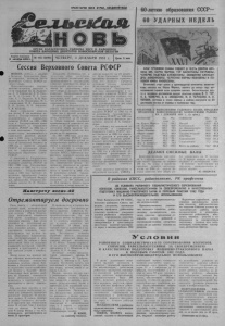 ПРОЛЕТАРИИ ВСЕХ СТРАН, СОЕДИНЯЙТЕСЬ! ОРГАН КАРАСУКСКОГО РАЙКОМА КПСС И РАЙОННОГО СОВЕТА НАРОДНЫХ ДЕПУТАТОВ НОВОСИБИРСКОЙ ОБЛАСТИ 60-летию образования СССР- 60 УДАРНЫХ НЕДЕЛЬ Газета основана 2 октября 1930 г. № 145 (6095) ЧЕТВЕРГ, 3 ДЕКАБРЯ 1981 г. Цена 2 коп. Сессия Верховного Совета РСФСР МОСКВА. (ТАСС). 1 декабря в Большом Кремлевском Двор це открылась четвертая сессия Верховного Совета РСФСР де сятого созыва. Продолжительными аплодис ментами встретили депутаты и гости товарищей Ю. В. Андропо ва, А. П. Кириленко, А. Я. Пель ше, -М. А. Суслова, Н. А. Тихо.- нова, К. У. Черненко, В. В. Куз нецова, Б. Н. Пономарева, М. С. Соломенцева, И. В. Капитонова, В. И. Долгих, М. В. Зимянина, К. В. Русакова. Была утверждена повестка дня сессии. В нее включены во просы о Государственном плане экономического и социального развития РСФСР на 1981 — 1985 годы, о Государственном плане экономического и социального развития РСФСР па 1982 год и о ходе выполнения Государст венного плана экономического и социального развития респуб лики в 1981 году, о Государст венном бюджете РСФСР на 1982 год и об исполнении бюджета за 1980 год, о проектах законов РСФСР об автономных облас тях, об утверждении Указов Президиума Верховного Совета РСФСР. ’ С докладом о Государствен ном плане экономического и со циального развития РСФСР на 1981 — 1985 годы, Государствен ном плане на 1982 год и о ходе выполнения Государственного плана в 1981 году выступил за- Докладчик подчеркнул, что в пятилетием плане республики предусмотрены динамичный рост промышленного и сельскохозяй ственного производства, меры по концентрации капитальных вло жений, по дальнейшему освое нию Сибири и Дальнего Востока, развитию Нечерноземной зоны, экономики каждой автономной республики, всех краев и облас тей РСФСР. Усилена социальная направленность плана. В проекте по большинству ос новных показателей предусмат риваются более напряженные за дания, чем в десятой пятилетке. Национальный доход за пяти летку увеличится на 22 процен та. Объем ■товарной продукции промышленности намечается уве личить на 25 процентов, а сред негодовой объем валовой про дукции сельского хозяйства воз растет на 13 процентов. На 1981 — 1985 годы для сель ского хозяйства РСФСР выде ляется 102 миллиарда рублей го сударственных капитальных вло жений и средств колхозов. В соответствии с социальной программой, утвержденной XXVI съездом КПСС, намечается осу ществить широкую систему мер по дальнейшему повышению уровня жизни народа. В частно сти, общественные фонды по требления увеличатся по сравне нию с 1980 годом на 22 про цента и превысят в Г985 году 82 миллиарда рублей. Средне- зяйстве возрастет на 24 процен та. Будет выполнена большая программа жилищного строитель ства, что позволит улучшить жилищные условия примерно 30 миллионам граждан. Характеризуя Государствен ный план экономического и со циального развития РСФСР на 1982 год, докладчик сообщил, что намеченные в нем темпы роста обеспечивают достижение зада ний; установленных на два года одиннадцатой пятилетки. С докладом о Государственном бюджете РСФСР на 1982 год и об исполнении Государственно го бюджета РСФСР за 1980 год выступил министр финансов рес публики депутат А. А. Бобров ников. Он сообщил, что внесенный на рассмотрение и утверждение Верховного Совета. РСФСР про ект бюджета па 1982 год опреде лен по доходам и расхода^ в сумме 75264,7 мил