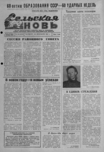 60-летию ОБРАЗОВАНИЯ СССР — 60 УДАРНЫХ НЕДЕЛЬ ПРОЛЕТАРИИ ВСЕХ СТРАН, СОЕДИНЯЙТЕСЬ» ОРГАН КАРАСУКСКОГО РАЙКОМА КПСС И РАЙОННОГО СОВЕТА НАРОДНЫХ ДЕПУТАТОВ НОВОСИБИРСКОЙ ОБЛАСТИ Газета основана 2 октября 1930 г. Цена 2 кон. № 154 (6104) ЧЕТВЕРГ, 24 ДЕКАБРЯ 1981 г. СЕССИЯ РАЙОННОГО СОВЕТА Трудовая вахта полеводов Вчера в Доме Советов состо ялась восьмая сессия Карасук- ского районного Совета народ ных депутатов (семнадцатого со зыва). Сессию открыл председатель райисполкома т. Кульневич С. В. По предложению директора мех- лесхоза, депутата т. Косяка Н. А. председателем сессии избран т. Баранников А. С., депутат изби рательного округа №87, пред седатель колхоза «Новая семья», секретарем — т. Галкина А. И., депутат избирательного округа № 37, учительница железнодо рожной школы № 176, На сессии обсуждались вопро сы: «О плане экономического и социального развития района на 1981 — 1985 годы, плане эко номического и социального раз вития района па 1982 год и хо де выполнения плана, на 1981 В новом году — к новым успехам Высокопроизводительным тру дом отмечают деповчане удар ные недели Всесоюзного со ревнования, посвященного 60- летию образования СССР. Мно гие машинисты цеха эксплуа тации устойчиво добиваются экономии дизельного топлива и электроэнергии. Этому, естест венно, способствует четко орга низованное . социалистическое соревнование за бережливое и рациональное расходование энер горесурсов на тягу поездов сре ди всех локомотивных бригад, а также та теплотехническая ра бота, которую проводит маши нист-инструктор М. С. Давыден ко. Хорошей экономии добились машинисты электровозов (при чем они же перевыполнили за данную техническую скорость и перевезли сверх нормы много грузов) В. Д. Каноненко, А. Е. Пиманов, А. К. Чигиринский, В. Г. Кожушко и многие дру гие. Главное внимание в поездной работе всегда уделяется без опасности движения. И многое зависит в этом вопросе от на К СВЕДЕНИЮ ДЕЛЕГАТОВ 44-й РАЙОННОЙ КОМСОМОЛЬСКОЙ КОНФЕРЕНЦИИ Карасукский райком ВЛКСМ сообщает к сведению делега тов, что 44-я районная отчетно-выборная комсомольская кон ференция открывается 25 декабря 1981 года в 11 часов утра в помещении Дома культуры железнодорожников. Регистрация делегатов производится 24 декабря с 8 до 19 часов в помещении РК ВЛКСМ и 25 декабря с 8 часов в по мещении Дома культуры железнодорожников. год», «О бюджете района на 1982 год п об утверждении от чета об исполнении бюджета рай она за 1980 год». С докладом по первому вопро су выступил т. Кульневич С._В., председатель райисполко ма, по второму вопросу — заве дующий райфо т. Анциферов 11. Ф. Содоклад от имени посто янной планово-бюджетной ко миссии районного Совета сделал ее председатель т. Семененко М. Т. В ходе обсуждения вопросов на сессии выступили депутаты т.т. Агеев И. Г., председатель исполкома городского Совета, Ромащенко Г. И., председа тель колхоза им. Карла Маркса, Швец Б. Г., начальник СМУ УС «Новосибирскводстрой», Прибо ра Е. Е., доярка Хорошинского совхоза, Клименко Д. В., предсе рядчиков локомотивных бригад, которые внимательно следят за регулировкой часов, стараются не допускать, чтобы бригада уезжала в поездку не отдохнув шей как следует. Добросовест но справляются со своими обя занностями Л. Н. Шпирко, В. А. Мананникова, М. Н. Соколов ская. Не менее' ответственная рабо та у вызывных локомотивных бригад, ведь от своевременного в