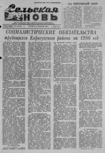 ПРОЛЕТАРИИ ВСЕХ СТР АН, СО ЕД ИНЯЙТЕСЬ! ОРГАН КАРАСУКСКОГО РАЙКОМА КПСС И РАЙОННОГО СОВЕТА НАРОДНЫХ ДЕПУТАТОВ НОВОСИБИРСКОЙ ОБЛАСТИ № 9 (6744) ЗА ПРОЧНЫЙ МИР Газета основана 2 октября 1930 г, ЧЕТВЕРГ, 23 ЯНВАРЯ 1986 г. Цена 3 коп. — Мы, прошедшие войну, знаем ее ужасные бедствия, а потому горячо одобряем Заявле ние Генерального секретаря ЦК КПСС М. С. Горбачева, в кото ром выражено стремление пар тии и правительства к прочному миру на земле, — сказал в сво ем выступлении на митинге в с. Благодатном ветеран войны и труда И. В. Мартыко. — Это Заявление является программой мира нашего . государства. Вы ступивший призвал односельчан крепить экономику колхоза са моотверженным трудом, строгим соблюдением производственной дисциплины, безусловным выпол нением стоящих задач в две надцатой пятилетке. Участники митинга выразили уверенность в том, что разум людей доброй воли возобладает над ядерным безумием. Присут ствующие единодушно поддержа ли Заявление руководителя на шей партии. В. ВАСИЛЬЕВ, секретарь партбюро колхо за им. Тельмана. СОЦИАЛИСТИЧЕСКИЕ ОБЯЗАТЕЛЬСТВА трудящихся Карасукского района на 4986 год Трудящиеся Карасукского района, встав на трудовую вахту по достой, ной встрече ХХѴП съезда КПСС, вместе со всей страной идут к нему, исполненные решимости самоотвер женным трудом обеспечить стратеги ческую линию партии иа ускорение социально-экономического развития общества. Активно участвуя во Все- . союзном социалистическом соревнова нии, внесли весомый вклад в завер шение года и одиннадцатой пятилетки в целом. Район досрочно выполнил годовой и пятилетний планы продажи молока государству, годовой план по мясу, выполнен план по реализации про мышленной продукции, укрепилась материально-техническая база сель ского хозяйства и других отраслей агропромышленного комплекса, уве личились закупки сельскохозяйствен, ной продукции, больше заготовлено кормов. Введены в действие объекты социально-бытового назначения, по строены жилые дома общей площадью 30 тыс. кв. м, получили развитие все виды транспорта, увеличилась прода. жа товаров и реализация бытовых услуг населению, возросла творческая и общественная активность работников народного образования, культуры, по лучило дальнейшее развитие здраво охранение. Трудящиеся района с глубоким удовлетворением восприняли решения апрельского и октябрьского (1985 г.) Пленумов ЦК КПСС и рассматривают их как конкретную программу на 12-ю пятилетку. По инициативе коллектива локомо тивного депо, работающего под деви зом: «XXVII съезду КПСС — 27 удар, ных декад», широкое развитие полу чило соревнование за перевыполнение плановых заданий на 1986 год по рос. ту производительности труда и сни жению себестоимости выпускаемой продукции. Большинство коллективов обязались досрочно выполнить двухмесячные планы к дню открытия XXVII съезда КПСС. Широкое распространение по. лучило движение дополнительно отра ботать всем предприятиям и хозяйст вам 2 дня в году на сэкономленных материалах, сырье и топливе. Животноводы района выступили инициаторами в областном социалисти ческом соревновании по успешному проведению зимовки скота, увеличе нию производства и продажи продук. тов животноводства в зимний период 1985 — 1986 гг„ по достойной встре че XXVII съезда КПСС. Учитывая репіающую роль челове ческого фактора в решении всех во пр