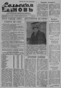 ПРОЛЕТАРИИ ВСЕХ СТРАН, СОЕДИНЯЙТЕСЬ! ОРГАН КАРАСУКСКОГО РАЙКОМА КПСС И РАЙОННОГО СОВЕТА НАРОДНЫХ ДЕПУТАТОВ НОВОСИБИРСКОЙ ОБЛАСТИ 1 азета основана г октября 1930 г № 21 (6756) ЧЕТВЕРГ, 20 ФЕВРАЛЯ 1986 г. Цена 3 коп. Занятие дозорных Состоялось очередное заня тие председателей групп народ ного контроля района. На нем обменялись опытом работы до зорных председатели групп: Т. И. Олейник — мясокомби нат, А. Т. Сутулов — СМУ УС «Новосибирскводстрой», Л. Г. Яковлев — Карасукские элек. тросети, В. К. Харченко — мехлесхоз. С вопросом об использовании средств гласности в работе на родных контролеров перед при сутствующими выступил • от. ветственный секретарь редак ции газеты «Сельская новь» Е. П, Астахов. Инспектор РК НК О. П. Савищенко рассказа ла о порядке оформления де лопроизводства в группах НК. О совместной работе «Комсо. мольского прожектора» и на. родных контролеров говорил участникам семинара второй се кретарь РК ВЛКСМ, началь ник районного штаба «КП» А. С. Бондарев. Председатель РК НК Г. ГЕ Кадатко ознакомил присутст вующих с постановлением Ко митета народного контроля СССР о предстоящих отчетах групп и постов дозорных перед избравшими их коллективами и подвел итоги занятия. Г. ПЕТРОВ. XXVI/ СЪЕЗДУ КПСС- ДОСТОЙНУЮ ВСТРЕЧУ! Лидируют ПЛЕНУМ ЦК КПСС 18 февраля 1986 г. состоялся Пленум Центоального Коми, тета Коммунистической партии Советского Союза. Пленум обсудил следующие вопросы: 1. О Политическом докладе Центрального Комитета КПСС XXVII съезду Коммунистической партии Советского Союза. 2. Об основных итогах общепартийного и общенародного об. суждения проекта новой редакции Программы КПСС и внесении его на рассмотрение XXVII съезда КПСС. 3. Об итогах обсуждения изменений в Уставе КПСС и вне сении. проекта измененного Устава партии на рассмотрение XXVII съезда КПСС. 4. О докладе XXVII съезду КПСС об Основных направле ниях экономического и социального развития СССР на 1986 — 1990 годы и на период до 2000 года. 5. Об итогах всенародного обсуждения проекта «Основные направления экономического и социального развития СССР на 1986 — 1990 годы и на период до 2000 года» и внесении этого проекта на рассмотрение XXVII съезда КПСС. По этим вопросам заслушаны доклады товарищей Горбаче ва М. С. И' Рыжкова Н. И. Пленум одобрил представленные до клады, проекты новой редакции Программы КПСС, изменен ного Устава партии и Основных направлений и принял реше ние внести эти документы на рассмотрение предстоящего XXVII съезда Коммунистической партии Советского Союза. На Пленуме рассмотрены ‘ организационные вопросы. Пленум избрал т. Ельцина Б. Н. кандидатом в члены По литбюро ЦК КПСС и освободил его от обязанностей секретаря ЦК КПСС в связи с переходом на работу в Московский го родской комитет партии. . Пленум освободил т. Гришина В. В. от обязанностей члена Политбюро ЦК КПСС в связи с уходом на пенсию. Пленум освободил т. Русакова К. В. от обязанностей секре таря ЦК КПСС в связи с уходом на пенсию. ■■ Животноводство-ударный фронт СУТОЧНЫЕ НАДОИ МОЛОКА В ХОЗЯЙСТВАХ РАЙОНА НА 18 ФЕВРАЛЯ 1986 ГОДА 1 гр. — надой от коровы в сутки, 2 гр. — ± к соответст вующему периоду 1985 года, 3 гр. — жирность молока. Калачинский им. Тельмана им. Карла Маркса Студеновский им. Мичурина им. Ленина им. Калинина «Вп. к коммунизму» им. Дзержинского «Российский» «Октябрь» «Маяк Ильича» им. Куйбышева «Новая семья» им. Жданова Калино