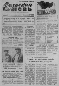ПРОЛЕТАРИИ ВСЕХ СТРАН, СОЕДИНЯЙТЕСЬ! ВТОРНИК, 3 ИЮНЯ 1986 г. № 67 (6802) Цена 3 коп. зооооооооооооооооооооооооооооооооооооооооооооооооооооооооооооооооооооооооооооооооооооооооооооооооогеоооооеоооееоооооеоооооооог Газета основана 2 октября 1930 г. ОРГАН КАРАСУ КСКОГО РАЙКОМА КПСС И РАЙОННОГО СОВЕТА НАРОДНЫХ ДЕПУТАТОВ НОВОСИБИРСКОЙ ОБЛАСТИ Механизаторы! Помните, что при запаздывании с сенокосом теря ется 20-30 проц, кормовых единиц и 25-35 проц, протеина. Активно вступайте в сенокос, боритесь за высокое качество кор мов! !ооооо®оооооооооооооосмэооооо®ооооооооооооо©ооооеоеоооооооооооооооо©ооооооооооооооооо(эоооооооеооо оеооосюоооооооаэооооеосюооооос НА ПОВЕСТКЕ — КОРМОЗАГОТОВКА ГОТОВЫ В Хорошинском совхозе сос тоялось заседание парткома, на котором обсуждался вопрос предстоящей кормозаготови тельной кампании. Выступив шие на заседании управляю щие всех отделений, руково дители агрономической и ин женерной службы доложили о готовности к зеленой жатве, о планах ее проведения. Следует отметить, что се нокосую страду первого года Повторный полив Высокий урожай сеяных трак на поливе решили полу чить нынче земледельцы Сту- деновского совхоза. Орошаемые участки имеются на трех от делениях хозяйства и на всех их развернулся уже повторный полив. Члены безнарядных зве ньев орошенцев, возглавляе мых опытными специалистами А. И Гейгером, Ю. Г. Литов ченко и Н. А. Боголеем, стро- Хороший урожай многолетних трав растет на поливных плантациях орошаемого участка № 1 колхоза им. Тель мана. Члены безнарядной бригады А. А. Михайлюк и Д. Ф. Миллер включили в работу свои дождевальные аг регаты ДДА-100 еще в первой декаде мая и сейчас ведут уже повторный полив костра. Каждый гектар получает до 400 кубометров живительной влаги, это гарантирует пол новесный сбор сена. На снимке: механизаторы-орошенцы А. А. Михайлюк и Д. Ф. Миллер. Указ Президиума Верховного Совета РСФСР О СОЗЫВЕ ВЕРХОВНОГО СОВЕТА РСФСР Президиум Верховного Совета РСФСР постановляет: ■ созвать третью сессию Верховного Совета Российской Со ветской Федеративной Социалистической Республики одинна дцатого созыва 1 июля 1986 года в городе Москве. Председатель Президиума Верховного Совета РСФСР В. ОРЛОВ. Секпетарь Президиума Верховного Совета РСФСР X. НЕШКОВ. Москва, 30 мая 1986 года. * * * Президиум Верховного Совета РСФСР сообщает, что на рассмотрение третьей сессии Верховного Совета РСФСР один надцатого созыва имеется в виду внести следующие вопросы: 1. О Государственном плане экономического и социального развития РСФСР на 1986 — 1990 годы. 2. Об утверждении Указов Президиума Верховного Совета РСФСР. ~ двенадцатой пятилетки хозяй ство встречает в самой высо кой готовности. Вся уборочная техника стоит на исходных по зициях и через день-другой се нокосные угодья совхоза огла сятся дружным гулом машин. Особое внимание нынче кор мозаготовители будут уделять качеству фуража. И. ГЛАДКОВ, секретарь парткома Хо- рошинского совхоза. го выдерживают технологию полива, задают на гектар оп тимальное количество живи тельной влаги. В ближайшие дни орошае мое поле совхоза расширится еще на 100 гектаров, в строй действующих войдет новый ме лиорированный участок. В. МЕРГЕЛЬ, секретарь парткома Сту- деновского совхоза. К СЕНОКОСУ На период предстоящей зи мовки общественного стада по леводам Калиновского совхоза пре