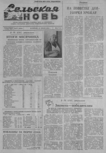 ПРОЛЕТАРИИ ВСЕХ СТРАН, СОЕДИНЯЙТЕСЬ! ОРГАН КАРАСУКСКОГО РАЙКОМА КПСС И РАЙОННОГО СОВЕТА НАРОДНЫХ ДЕПУТАТОВ НОВОСИБИРСКОЙ ОБЛАСТИ Репортаж НА ПОВЕСТКЕ ДНЯ. УБОРКА УРОЖАЯ Газета основана 2 октября 1930 г. В РК КПСС, райисполкоме ИТОГИ МЕСЯЧНИКА СОРЕВНОВАНИЯ ПО ПЕРИОД УДАРНОГО ПОДВЕДЕНЫ ИТОГИ ЗАГОТОВКЕ КОРМОВ МЕСЯЧНИКА. Рассмотрены итоги социали стического соревнования в хо зяйствах по заготовке кормов в период ударного месячника с 25 июня по 25 июля. Бюро РК КПСС и райисполком вви ду невыполнения задания удар ного месячника по заготовкам сена, сенажа и ВТМ среди совхозов первенство постано вили не присуждать. Среди колхозов первое ме сто с вручением переходящего Красного Знамени присудить колхозу «Новая семья» (пред седатель т. Баранников А. С., секретарь партбюро т. Дени сенко А. Г., председатель ис полкома сельского Совета на родных депутатов т. Петров В. В., председатель профкома т. Греб В. "., сомольской организации т. Ку ликов А.), выполнил месячника ‘ по ’ заготовке на 174 проц, сенажа - проц. В. секретарь ком- Коллектив колхоза задание ударного сена 152 СВЕДЕНИЯ О ВЫПОЛНЕНИИ ЗАДАНИЯ УДАРНОГО МЕСЯЧНИКА ПО ЗАГОТОВКЕ КОРМОВ (В ПРОЦ,). 1 гр. — сено, 2 гр. — сенаж, 3 гр. «Новая семья им. Ленина «Российский» им, Куйбышевѣ «Маяк Ильича» Хорошинский им. Дзержинского Калачинский им. Карла Маркса им. Мичурина им. Тельмана «Октябрь» им. Калинина «Вперед к коммунизму» Плодово-ягодный Калиновский Студенрвский им. Жданова Всего по району . — втм. 174 152 — 116 — — 115 — — 107 — 75 105 — — 99 — ' 6 93 — 83 92 , 35 9 92 1 _ 30 88 — — 82 из 37 82 86 15 80 — 77 — — 70 — — — 65 — -- — 63 66 29 59 — — 90 35 29 СВЕДЕНИЯ О ВЫПОЛНЕНИИ ГОДОВОГО ПЛАНА ЗАГО ТОВКИ КОРМОВ (В ПРОЦ) ! 1 гр. — сено, 2 гр. — , сенаж, 3 «Новая семья» Калачинский им. Тельмана «Российский» «,Маяк Ильича» им. Карла Маркса Хорошинский им. Ленина Студеновский' 4 «Октябрь» НАКАЗАНЫ ЗА В плодово-ягодном совхозе из-за некачественной скирдов- ки допущена порча значитель ного количества сена. Район ный комитет народного контро ля рассмотрел на своем оче редном заседании этот факт и наказал виновных. Исполня ющему обязанности директора совхоза С. В. Терещенко по ставлено на вид. Управляюще му Черноозерским отделением , В. И. Ерху и главному агроно- № 91 (6826) ВТОРНИК, 29 ИЮЛЯ 1986 г. В Отмечено, что восемь хо зяйств — совхозы Калачин ский, Хорошинский, «Россий ский», колхозы «Новая семья», им Тельмана, «Маяк Ильича», им. Карла Маркса, им. Ленина справились с годовым планом накопления сена. Вместе с тем указано на крайне неудовлетворительную работу по заготовке кормов в совхозах Калиновском, им. Дзержинского, плодово-ягод ном, колхозах «Вперед к ком мунизму», им. Жданова, им. Калинина. Бюро РК КПСС и райиспол ком выразили уверенность, что механизаторы района еще ши ре развернут соревнование, ак тивно продолжат накопление сена, широким фронтом раз вернут закладку сенажа, при готовление ВТМ и гранул. Вре мя, оставшееся до начала убор ки хлебов, яужномилхсималь-но использовать для. укрепления кормовой базы. гр. — ВТМ. им. Мичурина 87 — — 127 51 35 им. Куйбышева 76 — 107 127 ИЗ 38 им. Калинина 74 — — 123 — — им. Жданова 73 ■ — — 118 — — Плодово-ягодный 70 — — 112 — 30 им. Дзержинского 68 — 114 109 — 9 «Вперед к коммун.» 58 — — 89 Калиновский 50 — — 88 85 16 По району 93 39 38 ПОРЧУ СЕНА му А. В. Булыгину объявлен строгий выговор, на них нало жен денежный начет в разме ре месячного оклада. Админи страцию хозяй