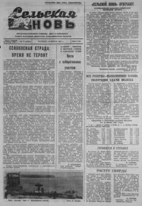 ПРОЛЕТАРИИ ВСЕХ СТРАН, СОЕДИНЯЙТЕСЬ! ОРГАН КАРАСУКСКОГО РАЙКОМА КПСС И РАЙОННОГО СОВЕТА НАРОДНЫХ ДЕПУТАТОВ НОВОСИБИРСКОЙ ОБЛАСТИ Газета основана 2 октября 1930 г. № 73 (6964) ЧЕТВЕРГ, 18 ИЮНЯ 1987 г. Цена 3 коп. СЕНОКОСНАЯ СТРАДА: ВРЕМЯ НЕ ТЕРПИТ Первую тысячу центнеров сена заскирдовали в начале этой недели механизаторы Калачинского совхоза. Здесь все отде ления дружно вошли в сенокос, между кормодобывающими звеньями разворачивается соцсоревнование за его успешное проведение, накопление максимального количества сена с вы соким содержанием питательных веществ. А хорошее качество можно получить лишь при своевременной косовице трав. К сожалению, начало этой кампании показывает, что мно гие хозяйства недопустимо затянули выход техники на луга, находя десятки причин для оправдания, в том числе выстав ляя и такой довод: мол, пусть травы подрастут, наберут боль шую массу. Это совершенно несостоятельный и порочный ар гумент, подрывающий качественную базу кормопроизводства. Ведь корма ценны содержанием в них белка и каротина, теми питательными веществами, которые дают рост надоев и при весов. Именно со второй декады июня наступили лучшие сроки уборки злаковых многолетних трав — костра, житняка, сме шанных посевов. А их предстоит убирать на 25 тысячах гек таров, и, по мнению специалистов, в эти дни они содержат, например, наибольшее количество каротина — до 260 — 300 мг, а потом ценность их падает и содержание каротина снижается До 150 — 200 мг. Но многие управляющие и бригадиры пока находятся в плену старых представлений, гипнотизируются ва ловым сбором сена, не беспокоясь о ценности его. Нужно убе дительно, через экспресс-лаборатории показать несостоятель ность и вредность такого подхода, через анализ кормов раскрыть звеньям и бригадам картину истинного положения, через опла ту за качество стимулировать их труд. И правильно поступают полеводы колхозов им. Тельмана им. Калинина, Студеновского совхоза, активно ведущих косо вицу трав, особенно на поливе, с тем, чтобы своевременно под кормить и полить убранные площади и получить богатый сбор со второго укоса. В хозяйствах пока робко применяются активные формы сушки трав. Опыт и практика других районов убедительно показывают их эффективность. Прежде всего нужно интенсив но работать с валками, не ждать пока в естественных пассив ных условиях они подсохнут, а применять через несколько ча сов ворошилки, боковые грабли. Это в 3 — 4 раза убыстряет время готовности сена к скирдо-вке, а значит и сохраняет в не сколько раз больше каротина, который разлагается под солнеч. ными лучами. Пока же техника для ворошения, имеющаяся в колхозе «Вперед к коммунизму». Калиновском и Студенов- ском совхозах, используется плохо Скоро хозяйства получат сорок ворошилок и их нужно незамедлительно пустить в дело. Неэффективно применяется принудительная сушка трав на вентиляционных установках СВУ-1,6. Они имеются в колхозе «Маяк Ильича», Хорошинском, Студеновском совхозах, снаб жены удобным металлическим каркасом. Нынче нужно с их помощью заготовить как можно больше высокопитательного сена, прежде всего для телят. Почти в полную нагрузку работает в Калачинском совхозе АВМ-1,5. Уже приготовлены первые десятки центнеров гранул из озимой ржи. Не сегодня-завтра начнется сдача их государ ству взамен на комбикорма. Но далеко не в