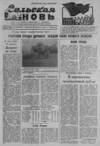 ПРОЛЕТАРИИ ВСЕХ СТРАН, СОЕДИНЯЙТЕСЬ! ОРГАН КАРАСУКСКОГО РАЙКОМА КПСС И РАЙОННОГО СОВЕТА НАРОДНЫХ ДЕПУТАТОВ НОВОСИБИРСКОЙ ОБЛАСТИ Газета основана 2 октября 1930 г. № 102 (6993) ВТОРНИК, 25 АВГУСТА 1987 г. Цена 3 коп. 70-летию Великого Октября-достойную встречу ФЛАГ ТРУДОВОЙ СЛАВЫ поднят в честь уборочного звена колхоза им. Тельмана в составе Б. П. Волокитина, Б. Г. Тарадойны, И. И. Ковалева, В. В. Репало, М. И. Веймана и А. А. Квитко, пятью комбайнами скосившего 1097 гектаров хлебов, намолотившего 3381 центнер зев на и ведущего вспашку зяби. УЧАСТНИКИ СТРАДЫ! ДОРОЖИТЕ КАЖДЫМ ЧАСОМ ПОГОЖЕГО ВРЕМЕНИ! В совете РАПО, РК профсоюза Лидируют на жатве Рассмотрев ход уборки уро жая и вспашки зяби по сос тоянию на 20 августа, совет РАПО и президиум райкома профсоюза работников АПК об метили, что все хозяйства рай она в целом организованно вступили в уборку зерновых и силосных^ культур, ведут убор ку соломы с полей и вспашку зяби. На эту дату было ско шено 44 процента хлебов, об молочено — 14, убрано силос ных — 10, вспахано зяби 4 процента к плану. Хорошими темпами ведут работы осеняс го агрокомклекба Сіуденбв- ский и Калачинский совхозы, колхозы им. Калинина, им. Ми чурина, «Вперед к коммуниз му». Не набрали темпов на ко совице и обмолоте совхозы Хо- рошинский, Калиновский и «Октябрь», не начали уборку силосных совхоз «Российский» и колхоз им. Тельмана. Победителями соревнования признаны: среди совхозов — СТУДЕ- НОВСКИИ СОВХОЗ (директор т. Бунин В. Т., председатель профкома т. Ковтун М. И.',. Совхоз скосил 66 процентов зерновых, обмолотил 22 про цента при средней урожайно сти 14,2 центнера с гектара, убрал 12 процентов силосных, вспахал 2 процента зяби. Среди колхозов — КОЛХОЗ им. КАЛИНИНА (председатель т. Гергерт В. А., председатель профкома т. Момот В. В ). Колхоз скосил 55 процентов зерновых, обмолотил 30 про центов, убирает силосные, вы полнил план взмета зяби на 18 процентов. Студеновскому совхозу и колхозу им. Калинина вручены переходящие Красные знаме на совета РАПО и президиума райкома профсоюза работников АПК. Отмечена положительная ра бота на косовице зерновых в колхозах им. Тельмана и «Впе ред к коммунизму», на обмо лоте — в колхозах им. Мичу рина, «Новая семья», им. Ле нина, на подборке хлебов и ко совице силосных — в Кала чинском совхозе и в колхозе им. Карла Маркса, на уборке силосных — в плодово-ягод ном совхозе. Совет РАПО и президиум райкома профсоюза работни ков АПК призывают механиза торов, шоферов, работников то ков и элеватора, всех обслужи вающих подразделений еде лать ударной вторую декаду уборочной страды, развернуть действенное соревнование за скорейшее завершение косови цы хлебов, усилить темпы на обмолоте, организовать подра ботку зерна на токах, наладить четкий конвейер продажи хле ба государству и засыпки се мян. Ударными темпами ведут работы осеннего агрокомплекса по леводы Студеновского совхоза. Подробно о холе страды 87 в хозяйстве рассказывают ма териалы 2 страницы. ДНЕВНИК УБОРКИ УРОЖАЯ В минувшие выходные дни практически во всех хозяйст вах района прошли дожди, правда, разной интенсивности. Наиболее обильными они ока зались в южной и западной зо не. В Студеновском совхозе местами выпало до 60 милли метров, в колхозе «Маяк Ильи ча» — более 30, з то время как в колхозах им. Тельмана, им. Куйбышева, им. Карла Маркса от 1 до 3 миллимет ров. В сложившихся погодных усл