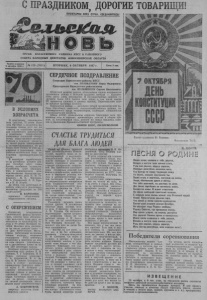 С ПРАЗДНИКОМ, ДОРОГИЕ ТОВАРИЩИ! ПРОЛЕТАРИИ ВСЕХ СТРАН, СОЕДИНЯЙТЕСЬ! ОРГАН КАРАСУКСКОГО РАЙКОМА КПСС И РАЙОННОГО СОВЕТА НАРОДНЫХ ДЕПУТАТОВ НОВОСИБИРСКОЙ ОБЛАСТИ Газета основана 2 октября 1930 г. № 120 (7011) В УСЛОВИЯХ ХОЗРАСЧЕТА В преддверии знаменатель ного события, 70-летия Вели кого Октября, о досрочном вы полнении планов двух лет пя тилетки по выработке продук ции собственного производства и розничному товарообороту рапортовал коллектив объеди нения общественного питания. Работая в условиях хозрасче та, новой формы планирования и самофинансирования, он до бился этого успеха за счет раг- ширения и укрепления мате риально-технической базы, по вышения производительности труда. В авангарде соревнующих ся за достойную встречу юби лея Октября идут члены бригад комбината кулинарии, коллективы кафе «Молодеж ное» и кондитерского цеха, возглавляемые опытными мас терами своего дела Н. М. Го- рожанко, В. Б. Марченко, В. А. Сотниковой, Е. Л. Гара жа и В. И. Журба. До конца года работники об щепита обязуются реализовать населению продукции на 380 тысяч рублей В. КАРПЕНКО, экономист объединения общественного питания. С ОПЕРЕЖЕНИЕМ Коллектив животноводов Грамотинской фермы Калинов ского совхоза брал обязатель ство выполнить план двух лет пятилетки по производству мо лока к 70-летию Великого Ок тября. Высокая цель достигну та на месяц раньше срока — ко Дню Конституции. Несте- ровцы, работающие на коллек тивном подряде, отправили государству 9055 центнеров продукции и наметили до кон ца года продать дополнитель- но к двухлетнему плану не ме нее 250 центнеров молока. Особенно хорошо работают в юбилейном году доярки Л. М. Звягина, Т. Г. Карюкина, Н. В. Порох, скотники коммунист С. А. Серповский, В. А. Ла- цук, В. В. Звягин. Большая за слуга в успехе коллектива принадлежит бригадиру дойна го гурта Г. Н. Лупашко — умелому организатору произ водства, словом и делом ока зывающей помощь животно водам. Суточный надой в эти дни на ферме, перешедшей на зимний распорядок, . значи тельно выше среднесовхозного. А. БОБРОВСКИЙ, секретарь парткома Кали новского совхоза. ВТОРНИК, 6 ОКТЯБРЯ 1987 г. Цена 3 коп. СЕРДЕЧНОЕ ПОЗДРАВЛЕНИЕ Секретарю Карасукского райкома КПСС тов. ГОЛОВАТОМУ Ивану Федоровичу. Председателю Карасукского райисполкома тов. КУЛЬНЕВИЧУ Сергею Васильевичу. Областной комитет партии, облисполком горячо поздравляют тружеников района с большой трудовой победой — выполне нием сдачи хлеба государству. В государственные . закрома от гружено более 53,5 тысячи тонн зерна, в том числе свыше 90 процентов сильных и ценных пшениц. Перевыполнен план по продаже крупяных культур. Одержанная победа — результат четкой организаторской ра боты партийных, советских, сельскохозяйственных органов, са моотверженного труда механизаторов, полеводов, специалистов и руководителей хозяйств. Обком КПСС, облисполком сердечно благодарят всех тру жеников села и горожан, принимавших участие в уборке уро жая, за плодотворный труд, желают им новых трудовых успе хов в реализации Продовольственной программы. ОБКОМ КПСС, ОБЛИСПОЛКОМ. СЧАСТЬЕ ТРУДИТЬСЯ ДЛЯ БЛАГА ЛЮДЕЙ Одной иУ главных гарантий прав, провозглашенных Консти туцией, Является право на са моотверженный и высокопро изводительный труд. Это пре красно понимает и коллектив нашего столярного цеха ди станции гражданских сооруже ний. Мы 