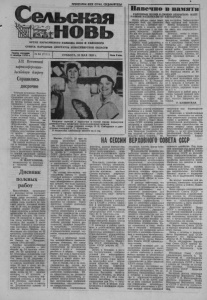 ПРОЛЕТАРИИ ВСЕХ СТРАН, СОЕДИНЯЙТЕСЬ! новь ОРГАН КАРАСУКСКОГО РАЙКОМА КПСС И РАЙОННОГО СОВЕТА НАРОДНЫХ ДЕПУТАТОВ НОВОСИБИРСКОЙ ОБЛАСТИ Навечно в памяти Газета осповааа 2 октября 1930 ѵ. № 64 (7111) XIX Всесоюзной партконференции достойную встречу Справились досрочно Успешно встречают Всесоюз ную партийную конференцию труженики мясного цеха Кара- сукского агропрома. На полто ра месяца раньше срока они справились с программой двух с половиной лет двенадцатой пятилетки по продаже мяса. За истекший период на мясо комбинат они поставили 134,5 тысячи центнеров скота. Наи более весомый вклад внесли животноводы совхозов им. Дзержинского, Калачинского, «Российский», колхозов «Ма як Ильича», им. Тельмана, им. Карла Маркса. Заметно улуч шились- качественные показате ли: возрос среднесдаточный вес, больше поступает на прие мные пункты животных с выс шей и средней упитанностью. Во многих колхозах и совхо зах в текущей пятилетке зна чительно активизировалась работа по откорму скота. Свою роль в увеличении производст ва ценной продукции сыграло внедрение подряда, передовых приемов труда. К. ЖАНГАЗИНОВ, госинспектор по закупкам . и качеству сельхозпро дуктов. Дневник полевых работ . Неустойчивая, прохладная и с дождями погода последних дней несколько сдерживает темпы работ весеннего агро- комлекса. Тем не менее земле дельцы ряда хозяйств не сни жают накала посевной кампа нии. К 26 мая, по данным опе ративной сводки РАПО, зер новые культуры в районе были размещены на площади свыше 45 тысяч гектаров, что соста вило 55 процентов к плану, в том числе прибавка за среду достигла без малого 5 тысяч гектаров. Близки к окончанию сева колосовых полеводы кол хоза им. Карла Маркса, раз местившие эти культуры на 85 процентах плановых площадей. Вслед за ними идут земледель цы колхозов им. Куйбышева, им. Ленина, им. Мичурина, совхоза «Российский». Главная продовольственная культура — пшеница — раз мещена на 34 тысячах гекта ров, это 56 процентов к пла ну. Отдельные коллективы уже завершают заделку ее семян. Так, звено А. М. Андреева с первого отделения Калачинско го совхоза закончило сев пше ницы 26 мая и сразу же пе решло на гречишные поля. Силосные культуры разме щены почти на 10 тысячах гектаров — 43 процента к плану. Семена кормовых кор неплодов уложены в почву на 143 гектарах, картофеля — на 73, под овощами в совхозе им. Дзержинского освоено 19 гектаров пашни, СУББОТА, 28 МАЯ 1988 г. Цеи« 3 коп. Большим спросом у карасучан и гостей города пользуется хлебобулочная продукция железнодорожной пекарни. На снимке: (слева направо) пекарь Л. И. Свинаренко и заве дующая пекарней Р. Г. Каличенко. О коллективе хлебопеков читайте на 2 стр. Москва. (ТАСС). 25 мая на сессии Верховного Совета СССР завершилось проходив шее на раздельных заседаниях Совета Союза и Совета Нацио нальностей обсуждение проек. та Закона о кооперации в СССР. Депутатам было доло жено о результатах обсуждения проекта Закона в постоянных комиссиях палат, об изменениях и дополнениях, которые, по мнению комиссий, следует вне. сти в проект Закона о коопе рации. На сессии отмечалось, что сердцевина Закона — хозяй ственный механизм кооперации — вобрал в себя исторический опыт кооперативного движения, все лучшее, что было накопле. но в первые годы Советской власти, все передовое из прак. тической работы новых коопе ративов в сферах про