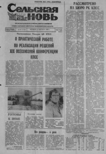 ПРОЛЕТАРИИ ВСЕХ СТРАН, СОЕДИНЯЙТЕСЬ.» ОРГАН КАРАСУКСКОГО РАЙКОМА КПСС И РАЙОННОГО СОВЕТА НАРОДНЫХ ДЕПУТАТОВ НОВОСИБИРСКОЙ ОБЛАСТИ РАССМОТРЕНО НА БЮРО РК КПСС Газета основана 2 октября 1930 г. Постановление Пленума ЦК КПСС О ПРАКТИЧЕСКОЙ РАБОТЕ ПО РЕАЛИЗАЦИИ РЕШЕНИЙ XIX ВСЕСОЮЗНОЙ КОНФЕРЕНЦИИ 1. Центральный Комитет КПСС отмечает, что XIX Все союзная конференция КПСС, старшая крупным событием в жизни партии и страны, при няла решения, реализация ко торых позволит значительно ускорить процессы перестрой ки, радикальной экономической реформы и демократизации советского общества. Прошедшие при высокой ак тивности делегатов прения по докладу ЦК КПСС и другим документам конференции носи ли откровенный и принципиаль ный характер, были проникну ты большой заботой о благе народа, судьбах социализма. Высказано и внесено много предложений по устранению не- ГОТОВЫ К ЗИМЕ На втором отделении сов хоза «Российский» (с. Кара- сарты) уже закончена работа по подготовке животноводче ских ферм к зимовке. Готовы к приему помещения для мо лодняка КРС, дойных гуртов. Зачастую в летний период на отделении ощущается не хватка рабочих рук. И тогда на помощь приходит сельская интеллигенция. Не первый год трудятся на благоустройстве и ремонте ферм учителя мест ной школы Д. М. Кайдаров, Б. Б. Кулманов, Ж. Ж. Тун- гушев и пенсионер П. Г. Крич- ко. В том, что своевременно и организованно проводится ремонт ферм, есть их заслу га. А. ТЕЗЕКПАЕВ, управляю -ий отделением № 2 совхоза «Российский». № 93 (7140) ЧЕТВЕРГ, 4 АВГУСТА 1988 г. Цена 3 коп. КПСС достатков, мешающих пере стройке и сдерживающих про цессы обновления, по проведе нию реформы политической си стемы, дальнейшей демократи зации жизни общества и пар тии. Значительная часть заме чаний и деловых соображений касается неотложных вопросов деятельности трудовых коллек тивов, улучшения снабжения населения, ускорения развития всех сфер сбслужчрания тру дящихся. Центральный Комитет КПСС обязывает партийные органи зации сосредоточиться на прак тическом осуществлении уста новок конференций, добиваясь того, чтобы их выполнение ста Молотят озимые Вот и наступила пора хле боуборки в нашем районе. Раньше всех включились в страду хлеборобы Калачинско го совхоза. Сейчас они уби рают озимую пшеницу, получая с гектара по 10 центнеров. Жатва набирает темпы. Впе реди у механизаторов косо вица и обмолот главной про Все резервы — в дело В сложных условиях засуш ливого лета трудятся живот новоды района. И это заметно сказывается на результатах. Снижена сдача молока в заче те, на 600 граммов меньше среднесуточный надой от ко ровы. С целью обязательного выполнения государственного плана продажи молока хозяй ства г едут закуп его ѵ ча- содѵиид. Более 20 цѵахий-. ло стержнем работы партии, всех государственных и обще ственных организаций, побуж дало людей действовать с пол- ной отдачей и ответственно стью 'за порученный участок. Решающее значение приобре тают инициатива й организо ванность коммунистов, актив ная позиция каждого члена пар тии в конструктивном разре шении возникающих проблем, утверждении новых подходов в политической, экономической, социальной и духовной сферах, в борьбе с недостатками, про явлениями бюрократизма, не дисциплинированности и без ответственности. Всю работу следует вести конкретно и на- (Ококчание на 2 стр.). д