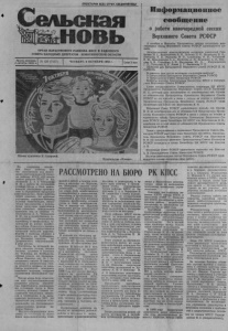 ПРОЛЕТАРИИ ВСЕХ СТРАН, СОЕДИНЯЙТЕСЬ! Сельская Ша-новь ОРГАН КАРАСУКСКОГО РАЙКОМА КПСС И РАЙОННОГО СОВЕТА НАРОДНЫХ ДЕПУТАТОВ НОВОСИБИРСКОЙ ОБЛАСТИ Газета основана 2 октября 1930 г. № 120 (7167) ЧЕТВЕРГ, 6 ОКТЯБРЯ 1988 г. Цена 3 коп Плакат художника Н. Сахаровой. Издательство «Плакат». Информационное сообщение о работе внеочередной сессии Верховного Совета РСФСР 3 октября в Большом Кремлевском дворце состоялась вне очередная сессия Верховного Совета РСФСР одиннадцатого со зыва. Аплодисментами присутствующие встретили товарищей Гор бачева ’ М. С., Воротникова В. И., Зайкова Л. Н., Медведева В. А., Никонова В. П., Рыжкова Н. И., Слюнькова Н. Н., Чебрикова В. М„ Шеварднадзе Э. А., Яковлева А. Н., Бирюкову А. П„ Вла сова А В., Лукьянова А. И., Маслюкова Ю. Д., Разумовского Г. П., Талызина Н. В., Язова Д. Т., Бакланова О. Д. Заседание вел Председатель Верховного Совета РСФСР Н. М. Грибачев. В повестку дня сессии включены следующие вопросы? О Председателе Президиума Верховного Совета РСФСР. О Председателе Совета Министров РСФСР. Вопросы внесены Центральным Комитетом КПСС и Президи умом Верховного Совета РСФСР. Слово предоставляется Генеральному секретарю ЦК КПСС, Председателю Президиума Верховного Совета СССР Горбачеву М. С., который внес предложение об освобождении тов. Орлова от обязанностей Председателя Президиума Верховного Совета РСФСР по его просьбе в связи с уходом на пенсию и избрании Председателем Президиума Верховного Совета РСФСР клена Политбюро ЦК КПСС тов. Воротникова В. И. Верховный Совет РСФСР удовлетворил просьбу тов. Орлова В. П. об освобождении его от обязанностей Председателя Прези диума Верховного Совета РСФСР в связи с уходом на пенсию и единогласно избрал Председателем Президиума Верховного Со вета РСФСР члена Политбюро ЦК КПСС тов. Воротникова В. И., освободив его в этой связи от обязанностей Председателя Совета Министров РСФСР. Затем с предложением о назначении Председателя Совета Ми нистров РСФСР выступил член Политбюро ЦК КПСС, Председа тель Президиума Верховного Совета РСФСР тов. Воротников В. И Он предложил назначить Председателем Совета Министров РСФСР кандидата в члены Политбюро ЦК КПСС тов. Власова А. В. Верховный Совет РСФСР единогласно назначил тов. Власова А. В. Председателем Совета Министров РСФСР. На этом внеочередная сессия Верховного Совета РСФСР один надцатого созыва закончила свою работу. На очередном заседа нии бюро райкома пар тии рассмотрело ход выпол нения постановления IX плену ма райкома КПСС «Об отчете членов райкома КПСС тт. Ко- логривова Д. А. и Чернышова В. М. о работе по улучшению условий труда и быта живот новодов, увеличению производ ства и переработки продукции животноводства». Бюро райкома КПСС отметило, что вопросам улучшения социально-бытовых условий животноводов, увели чению производства и перера ботки продукции животновод ства уделялось определенное внимание как со стороны тт. Кологривова Д. А., Чернышова В. М., так и хозяйственных ру ководителей, специалистов, партийных и профсоюзных ор ганизаций во многих хозяйст вах района. Повысился уровень механизации производственных процессов отраслей животно водства в колхозах «Вперед к коммунизму», им. Куйбышева, им. Калинина, совхозов им. Дзержинского, «Калачинский» и ряде других. Построены за истекший пе риод красные уголки, теплые туалеты, душевые в к