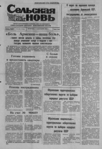 ПРОЛЕТАРИИ ВСЕХ С ГРАН, СОЕДИНЯЙТЕСЬ! Се/іьсная Шжновь ОРГАН КАРАСУКСКОГО РАЙКОМА КПСС И РАЙОННОГО СОВЕТА НАРОДНЫХ ДЕПУТАТОВ НОВОСИБИРСКОЙ ОБЛАСТИ Газета основана 2 октября 1930 г. | № 148 (7195) | ВТОРНИК, 13 ДЕКАБРЯ 1988 г. Цена 3 коп. «Боль Армении — наша боль» -ГОВОРЯТ ЖИТЕЛИ КАРАСУКА И РАЙОНА, ПРОТЯГИВАЯ РУКУ ПОМОЩИ АРМЯНСКОМУ НАРОДУ И РАЗДЕЛЯЯ С НИМ ТРАГЕДИЮ, ВЫЗВАННУЮ УЖАСНЫМ ЗЕМЛЕТРЯСЕНИЕМ На предприятиях и в хозяйствах, в школах и организациях проходят митинги трудящихся, школьников, на которых карасучане высказывают свои искренние и глубокие соболезнова ния братскому народу Армянской ССР, перечисляют в фонд помощи однодневные заработ ки, личные сбережения, предлагают провести субботники, высказывают желание взять на воспитание осиротевших армянских детей. Публикуем первую подборку информаций с предприятий и организаций. Готовы усыновить С болью О мерах по оказанию помощи населению Армянской ССР, пострадавшему В связи с землетрясением, повлекшим за собой большие разрушения и гибель десятков тысяч людей Армянской ССР, исполком районного совета на- родных депутатов решил: 1. Образовать районную чрезвычайную комиссию в со ставе: Филатов В. И. — зам. Дья- зам. от землетрясения — врач-педиатр районной больницы. — по формированию строи тельных бригад, студенческих отрядов и учета заявлений и предоставить квартиры В понедельник, 12 декабря, перед началом трудового дня в красном уголке мехлесхоза состоялся многолюдный ми тинг, в котором приняли уча стие рабочие, инженерно-тех нические работники, специали сты предприятия. Открывший митинг секретарь парторгани зации В. Манойло рассказал собравшимся о трагических событиях в Советской Арме нии, вызванных катастрофи ческим землетрясением, и пре дложил оказать населению братской республики матери альную помощь. Призыв парторга нашел еди нодушную поддержку участни ков митинга. Механизатор Н. Перов и начальник цеха В. Харченко внесли предложение сделать очередную субботу, 17 декабря, трудовым днем на предприятии и заработанные деньги перечислить в фонд помощи Армянской ССР. Выступившая художник- оформитель В. Козлова заяви ла, что ее, семья готова при нять на воспитание ребенка одной из пострадавших во вре мя землетрясения семей. Коллектив мехлесхоза го тов предоставить 3 — 4 квар тиры в селе Астродым для семей, потерявших кров в Ар мении. В. ГРИГОРЬЕВ. Помощь пострадавшим в сердце На всех отделениях, произ водственных участках, в учреж дениях Хорошинского совхоза состоялись собрания-митинги трудящихся. В своих выступлениях они предлагали создать донорский пункт для приема крови, ока зывать помощь материальными Они говорили чтобы всячески ствия тех лиц, которые раз жигают национальную рознь. Решено весь однодневный зара боток перечислить в помощь пострадавшим от землетрясе ния. Всего будет перечислено около 5 тысяч рублей. А. ХАРЧЕНКО, секретарь партийного бюро Хорошинского совхоза. денежными и средствами, также о том, пресекать дей- председателя райисполкома, председатель комиссии, Стол- бинская Н. М. — секретарь РК КПСС; депутат районного Совета, зам. председателя ко миссии, Шишкина Р. Р. — зав. райсобесом райисполкома, секретарь комиссии. Члены комиссии: ченко В. Н. — председателя горисполкома. Карманов М. И. — зам. на чальника отделения железной дороги, Квитко А. Н. — зам. председа
