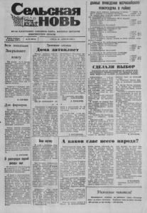 •ТГАН КАРАСУКСКОГО РАЙОННОГО СОВЕТА НАРОДНЫХ ДЕПУТАТОВ НОВОСИБИРСКОЙ области ДАННЫЕ ПРОВЕДЕНИЯ ВСЕРОССИЙСКОГО РЕФЕРЕНДУМА В РАЙОНЕ Общее число граждан, включенных ® списки — 34687 %' Число граждан, получивших бюллетени — 24906 71.8 По первым двум вопросам подсчет голосов от числа граж дан, получивших бюллетени. 1. Доверяете ли вы Президенту РФ Б. Ельцину Приняли участие в голосовании — 24832 Ответили «да» — 7357 29.6 Ответили «нет» — 16960 68,3 .Недействительных бюллетеней — 515 Газета основана 3 октября 1930 г. № 33 (8014) Весна земледельцев Закрывают, влагу Без малого на 6 тысячах гектаров сельхозугодий про вели ’ закрытие влаги земле дельцы акционерного обще ства «Студеновское» — это самый высокий показатель среди хозяйств района. А сре ди отделений впереди идет Богословское, механизаторы которого заборонили 1380 га. Вслед за ними идут централь ное и Демидовское, в активе которых также более чем по тысяче гектаров. Агрегаты с боронами рабо тают в основном на плантаци ях сеяных многолетних трав, которые созрели раньше дру гих угодий. Кроме них боро нятся также паровые и зябле вые фоны. Н. СЕРГЕЕВ. Для фермеров Поистине астрономических высот достигли цены на сель- екбхозяйственную технику. Поэтому приобретение новых Машин становится для селян все более проблемным делом.. И все же даже при таких небла гоприятных условиях техни чески парк карасукских зем ледельцев пополняется. Совсем недавно новенькие, пахнущие краской гусеничные тягачи Т-4 прямо на Алтай ском тракторном заводе, что в городе Рубцовске получили фермеры И. Суховеев, В. То карев и А. Солодки». Каждая машина обошлась ее хозяину в 2,1 миллиона рублей. Несколь ко владельцев крестьянских хозяйств в эти же дни купили гусеничные тягачи ДТ-75. Но вая техника уже включилась в работы весеннего агрокомплек са. Н. АНТОНОВ. О распорядке первой декады мая Из областной администрации 9э подписью и. о. главы В. П. Киселева поступило сообщение •ледующего содержания: «В евязи с многочисленны ми запросами о праздничных и выходных днях в первой дека де мая сообщаю, что согласно статье 65 КЗОТ Российской Федерации работа не произ водится 1, 2,<3, 4, 8, 9, 10 мая .1993 г. В эти дни допус каются работы, приостановка которых невозможна по про изводственно-техническим ус ловиям (непрерывные дейст вующие предприятия, учреж дения, организации), работы, в ьгз ыв а ем ы е необ ходим ос т ью обслуживания населения, а также неотложные ремонтные й погрузочно-разгрузочные ра боты». СРЕДА, 28 АПРЕЛЯ 1993 г. Тревожная ситуация Дома затопляет Осенью прошлого года бу ровая на территории школы № 1 подняла на болоте уро вень воды до такой отметки, на которой она не бывала в самые большие весенние па водки. Ко всему этому про шедшая зима дала много сне га. Тающий снег и заморожен ная вода из буровой создали угрожающее положение всем домам на улицах Луначарско го, Шукшина, Кутузова, Лазо и другим, примыкающим к ним и находящихся в зоне за топления от образовавшегося между ними болота. Особенно тяжелое положение в домах по ул.. Луначарского, (№№ 50-а, 50-6, 52, 54, 56, 60 и т. д.) Положение усугуб ляют прорывы нечистот (осе нью и весной) из школьного коллектора. Обо всем этом мы написа ли в заявлении руководству города и района с подписями представителей затопляемых улиц. Как же отреагировала ад- ♦ * «Приезжайте и посмотрите, как мы живем», — такой зво нок раздался в 