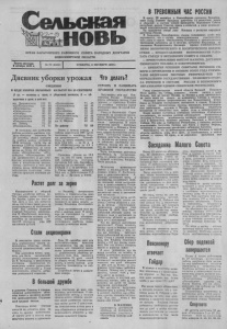ОРГАН КАРАСУКСКОГО РАЙОННОГО СОВЕТА НАРОДНЫХ ДЕПУТАТОВ НОВОСИБИРСКОЙ области Газета основана 2 октября 1930 г. Дневник уборки урожая СВЕДЕНИЯ О ХОДЕ УБОРКИ ЗЕРНОВЫХ (1 гр. — скошено в проц, к молочено в проц, к ней же) им. Дзержинского 100 91 «Ш-Курьинское» 100 85 «Морозовское» 98 68 «Карасукское» 96 96 «Октябрь» 90 80 «Студен овское» 86 74 «Калачинское» 79 58 «Благодатское» 77 54 им. Ленина 72 57 «Кукаринское» 71 71 В последние дни хлеборобы района основное внимание уде лили обмолоту зерновых. За 29 сентября общая прибавка на подборе в.алков составила 2839 гектаров, тогда как на косовице 1229 га. Особенно за метно подвинулась за среду жатва на полях АО «Карасук ское». «Кукаринское», «Рос сийское», «Морозовское», АП им. Дзержинского. А вот кучу- гурские, хорошинские, ирбиэин- ские и михайловские механи заторы сработали в этот день гораздо менее эффективно, не использовав полностью пода ренную природой хорошую по году. Растет долг за зерно Одновременно с уборкой урожая хозяйства района ве дут продажу зерна государст ву. Вернее, сдают его пока за так. Дело в том, что элеватор из-за отсутствия денег пока не рассчитывается за полученный хлеб. Как сообщил редакции главный бухгалтер предприя тия В. Щербатенко. задолжен ность элеватора селянам на 30 сентября за продукцию уро жая-93 составила уже 498 миллионов рублей. Стали акционерами В минувшую среду состоя лась конференция членов ак ционерного общества «Кара- сукский молконсервный ком бинат». Она проходила бурно, пове стка дня была насыщенной: доклад генерального директо ра В. Погадаева о финансовом состоянии предприятия, ут верждение совета директоров, внесение дополнений в Устав акционерного общеста, избра ние ревизионной комиссии. В большой дружбе е сельским Советом и админи страцией акционерного обще ства живет и трудится коллек тив преподавателей Студенов- ской средней школы. Благодаря этому учителя никогда не остаются один на один со своими проблемами А значит дети в полной мере получают знания; с удовольст № 79 (-8060) СУББОТА, 2 ОКТЯБРЯ 1993 г. КУЛЬТУР НА 30 СЕНТЯБРЯ уборочной площади, 2 — об- « Калин овское» «Хорошинское» «Маяк» «Российское» «Новая семья» «Рождественская» «Кучугурское» им. К. Маркса По району 71 45 68 46 68 41 63 43 55 45 53 44 46 24 45 43 75 59 Зерна с начала страды в районе намолочено 566 тысяч центнеров — вдесятеро боль ше прошлогоднего. Урожай ность на конец сентября соста вила 12,4 ц/га — от 21 ц в АО «Благодатское» до 5,9 ц в агрофирме «Рождествен ская». Силосные убраны на 18.5 тыс. га, это 93 проц. планта ций. урожайность кукурузы составила 145 ц/га. Картофель выкопан на 33 гектарах, набор клубней с 1 га достигает 100 ц. Семян зерновых засыпано 54,6 тыс. ц. Зяби вспахано 30,3 тыс. га — 32 проц, к плану. — Решение Финансового вопроса в правительстве явно затягивается и сегодня неизве стно, когда мы получим причи тающиеся за зерно деньги. — сказал Владимир Дмитриевич. Долг заготовителей селу ра стет с каждым днем. В основ ном он приходится ня АО «Студеновское». «Калачин ское». агрофирму «Октябрь», отгрузивших наиболее значи тельное количество зерна. День 29 сентября стал для молкомбинатовцев поистине историческим, так как теперь именно они становятся закон ными хозяевами предприятия — акционерного общества от" крытого типа. Они являются владельцами 51 проц, акций от общего числа. Решено прет ворять в жизнь взятый курс развития производств 