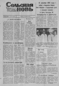 12 декабря 1993 года — выборы в Федеральное Собрание (Совет Федерации и Государственная Дума) и всенародное голосование по проекту Конституции РФ Газета основана 2 октября 1930 г. А ДОЛГИ ОСТАЮТСЯ По самым последним дан ным, земледельцы района к 17 ноября доставили на эле ватор без малого 172 тысячи центнеров зерна. Таким об разом, договорные обязатель ства к этой дате карасукские хлеборобы выполнили почти на 60 процентов. А коллекти вы трех хозяйств — АП им. Дзержинского, акционерного общества «Карасукское» и агрофирмы «Октябрь» свои планы существенно перекры ли. В общем объеме зерна ос новная доля — более 114 тыс. ц — приходится, естест венно, на пшеницу. Кроме нее селяне отправили в региональ ный фонд 21,5 тыс. ц овса, 20,3 тыс. ц проса, 8,1 тыс. ц ячменя, 4,7 тыс. ц гречки. Фермеры района отгрузили со своих полей 29,1 тыс. ц зерна, т. е. их вклад в кара- сукский каравай составляет 17 процентов. Свой общий до говор контрактации крестьян Сообщите о погибших В редколлегию Книги Па мяти поступили данные на погибших в годы Великой Отечественной войны. Среди них: Вандакуров Николай Аб рамович, 1920 года рождения, Варапулов Семен Фотёевич (1898), Видюк Иван Андрее вич (1908), Волков Тимофей Федотович (1889), Воднев Иван Егорович, Герегей Фе дот Петрович (1899), Гриба нов Иван Николаевич (1922), Гришнев Иван . Павлович (1912), Гузеев Егор Федоро вич (1910), Гришаев Андрей Павлович (1909). Горевой Пето Иванович (1913), Гриш ко Василий Андреевич (1921), Еременко Николай Федоро вич (1922), Волынец Андрей Григорович (192'0), Губин Иван Илларионович, Дунов 0 НАЛОГОВОЙ АМНИСТИИ Президент Российской Фе дерации Указом от 27 октяб ря 1993 г. № 1773 «О про ведении налоговой амнистии в 1993 году» в целях попол нения доходной части респу бликанского бюджета и обес печения финансирования пен сий, стипендий, государствен ных пособий, других социаль ных выплат населению поста новил: 1. Провести в Российской Федерации в период с момен та опубликования Указа Пре зидента от 27 октября 1993 г. № 1773 и до 30 ноября 1993 года включительно налоговую амнистию. 2. Установить, что все предприятия и физические лица, осуществляющие пред принимательскую деятель ность, объявившие до 30 но ября 1993 г. о своих неупла ченных налогах и налоговых платежах за 1993 год и пред шествовавшие годы и внесшие № 94 (8075) СУББОТА, 20 НОЯБРЯ 1993 г. ские хозяйства выполнили по чти на две трети. Стоимость проданного зер на превысила 1,5 миллиарда рублей. Однако из этой со лидной суммы элеватор вы платил селянам только 80 миллионов. Общая задолжен ность составляет 1 млрд. 470 млн. руб., в т. ч. АО «Сту- деновское» — 292 млн., АО «Калачинское» — 196 млн., АП им. Дзержинского — 179 млн., агрофирма «Октябрь» — 176 млн., АО «Новая се мья» — 73 млн. и т. д. — Если приплюсовать еще и задолженность молкомби- ната, составляющую 185 мил лионов рублей, то совсем не сложно представить, как тя жело выкарабкиваться селя нам из экономической пропас ти, — так коротко прокоммен тировал сложившуюся ситуа цию начальник инспекции по закупкам и качеству сельхоз продукции В. Бопблик. И. ТОЛСТИКОВ Василий Кириллович (1900), Дрезуля Егор Ефимович (1900). По данным архива Мини стерства Обороны, они при зывались из Карасукского района, однако в книгах при зыва РВК их нет. Все они в списках погибших по Карасук- скому району не значатся. Уважаемые земляки! Если вы что-либо знаете о перечис ленных людях, просьба сооб щить в редколлег