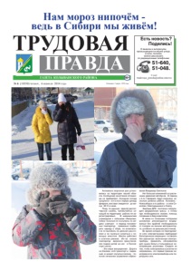 Основана 5 марта 1932 года № 6 (10350) ЧЕТВЕРГ, 6 ФЕВРАЛЯ 2014 ГОДА Есть новость? Поделись! О важном и интересном, происходящем на вашей улице, в селе, поселке, можно рассказать по редакционным телефонам: 51-640, 51-048. E-mail: trudovaya_pravda@online.sinor.ru ГАЗЕТА КОЛЫВАНСКОГО РАЙОНА ПРАВДА 16+ ТРУДОВАЯ Нам мороз нипочём - ведь в Сибири мы живём! Аномально морозные дни установились на территории нашей области. Сообщения синоптиков оптимизма не прибавляют. Холодная погода продлится почти всю первую декаду февраля, местами ожидается до минус 40о С и ниже. Пока, по данным единой диспетчерской службы, чрезвычайных ситуаций на территории района не зарегистрировано. В медицинские учреждения с сильными обморожениями больные не поступали, но медики советуют в период пониженных температур правильно подбирать одежду и обувь, по возможности не выезжать на дальние расстояния и не пытаться согреться с помощью алкоголя. Школы работают в штатном режиме. Из–за низких температур временно приостановлен подвоз детей из сел в Пихтовскую школу. - Эта мера вынужденная. Дорога не близкая, хотя транспорт и надежный, но может случиться всякое, - пояснил начальник управления образования Владимир Светюков. Нет больших изменений и в расписании движения автобусов. В период с 4 по 7 февраля будут отменены несколько дневных рейсов Колывань - Новосибирск и по району - в села Соколово, Новотырышкино и Скалу. Экипажи ДПС постоянно патрулируют федеральную трассу и готовы при необходимости оказать помощь попавшим в беду водителям. В связи со сложными погодными условиями рекомендуется воздержаться без крайней необходимости от поездок на личном автотранспорте, особенно на дальние расстояния. Во время холодов не перегружайте сети электрическими приборами! Категорически запрещено оставлять без присмотра включенные электроприборы, применять обогреватели для сушки белья и пользоваться неисправными розетками. Следите за тем, чтобы электровилки и розетки не нагревались, это первый признак неисправности электроприбора или перегрузки сети.