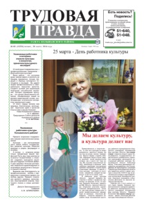 Основана 5 марта 1932 года № 12 (10356) ЧЕТВЕРГ, 20 МАРТА 2014 ГОДА Есть новость? Поделись! О важном и интересном, происходящем на вашей улице, в селе, поселке, можно рассказать по редакционным телефонам: 51-640, 51-048. E-mail: trudovaya_pravda@online.sinor.ru ГАЗЕТА КОЛЫВАНСКОГО РАЙОНА ПРАВДА 16+ ТРУДОВАЯ Уважаемые работники и ветераны отрасли культуры и искусства, хранители культурного наследия! От всей души поздравляем вас с профессиональным праздником – Днем работника культуры! Ваша работа - это состояние души, умение видеть и доносить до граждан прекрасное, лучшие традиции и образцы культурного потенциала и наследия. Вы дарите людям профессиональное и самодеятельное творчество артистов, создаете условия для реализации творческих способностей населения. Сегодня учреждения культуры - это центры общественного общения, объединяющие людей на духовно-нравственной основе, воспитывающие эстетическое восприятие окружающего мира. От всего сердца желаем вам здоровья, благополучия, воплощения творческих идей и проектов! Счастья вам и вашим близким! Глава Колыванского района В. П. АВЕРИН. Председатель Совета депутатов Колыванского района И. М. ВЕПРЕВА. *** Уважаемые работники культуры Колыванского района! Примите искренние поздравления с вашим замечательным праздником! Культура – это неотъемлемая часть жизни любого государства. Без развития культуры общество приходит в упадок, деградирует и погибает. А потому я искренне желаю только процветания вашей профессии! Пусть ваш труд никогда не останется незамеченным и позволит сохранить культурное наследие для будущих потомков! Доброго вам здоровья, больших достижений, морального удовлетворения от получаемых результатов и большого личного счастья! Выражаю вам благодарность за профессионализм, любовь к прекрасному и стремление привить эту любовь другим. Примите пожелания крепкого здоровья, вдохновения, неисчерпаемой энергии, творческого поиска и новых достижений! Депутат Законодательного Собрания А. М. ШПИКЕЛЬМАН. Преемственность в творчестве - это то, без чего культура не может развиваться, двигаться вперед. До сих пор за основу многих праздников берутся обряды «старины забытой». Народные танцы и песни радуют зрителей своей самобытностью сегодня, как и много лет тому назад. Мы слушаем классическую музыку, написанную в прошлые века, любуемся картинами, восторгаемся умением писателей и поэтов играть словесными образами. И вместе с этим культура - категория не постоянная, каждый век, каждый год привносит в нее что-то новое, свое. В районном доме культуры «Юность» принцип передачи мастерства и любви к профессии применяют на практике. И это, по мнению Людмилы Копылович, директора РДК «Юность», приносит свои плоды: вчерашние участники художественной самодеятельности сегодня уже сами делают первые шаги в своей профессиональной карьере. Один из примеров - Анастасия Демиденко, солистка народного ансамбля танца «Колыванские просторы» районного муниципального бюджетного учреждения «Колыванский Дом культуры «Юность» (на снимке слева), студентка второго курса Новосибирского государственного педагогического университета, отделения хореографии, руководитель заслуженный работник культуры Новосибирской области Александр Шульц. Участница двенадцатых молодежных дельфийских игр России. Дважды ей присуждалась сти