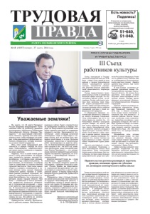 Основана 5 марта 1932 года № 13 (10357) ЧЕТВЕРГ, 27 МАРТА 2014 ГОДА Есть новость? Поделись! О важном и интересном, происходящем на вашей улице, в селе, поселке, можно рассказать по редакционным телефонам: 51-640, 51-048. E-mail: trudovaya_pravda@online.sinor.ru ГАЗЕТА КОЛЫВАНСКОГО РАЙОНА ПРАВДА 16+ ТРУДОВАЯ ПРЕСС-СЛУЖБА ГУБЕРНАТОРА И ПРАВИТЕЛЬСТВА НСО Вы знаете, что 18 марта Президент России Владимир Владимирович Путин назначил меня на должность временно исполняющего обязанности Губернатора Новосибирской области. Доверие Президента — это высочайшая ответственность. Конечно, приложу все свои силы, знания и опыт, чтобы оправдать это доверие, чтобы максимально эффективно исполнить обязанности, которые возложены на меня главой государства. Весь опыт моей предыдущей деятельности, в первую очередь на посту мэра Новосибирска, свидетельствует, как важно иметь понимание и поддержку своих земляков. Надеюсь, что и в своей новой должности я могу рассчитывать на инициативу, активность горожан, жителей Новосибирска, с которыми меня связывают многие годы совместной работы. Я рассчитываю на понимание, на добрый совет и содействие со стороны жителей сельской местности. Нам очень важно сберечь и развить сложившуюся в нашем регионе очень ценную традицию совместной работы горожан и селян, наше умение учитывать потенциал, интересы и перспективы как большого города Новосибирска, так и сельских территорий, малых городов области. Нам всем — независимо от места проживания, профессии, должности, независимо от политических воззрений — предстоит работать над серьёзными задачами. В поступательном движении Новосибирской области, в повышении её инвестиционной привлекательности и производственного потенциала, в укреплении социальной стабильности заинтересованы все мы. Эта работа не должна останавливаться ни на один день. Правительство области функционирует в рабочем режиме. Максимальное внимание сейчас будет сосредоточено на проведении посевной, в первую очередь на безусловном исполнении всех ранее принятых решений по поддержке аграрного сектора. Заканчивается отопительный сезон: впереди испытания инженерных сетей и подготовка к новому сезону, всё это должно быть проведено качественно и в срок. Большая программа ремонтных и строительных работ запланирована на дорогах области, по благоустройству территорий наших городов и сел. На 2014 год намечено выполнение ряда положений майских Указов Президента — это направление является приоритетным для меня. Задачи поставлены серьёзные, но и потенциал у Новосибирской области — значительный. Дорогие земляки! Я знаю, вы — люди талантливые, трудолюбивые, честные. Вы настоящие патриоты своей малой родины, граждане большой и сильной России. Думаю, вы представляете стремление деструктивных сил воспользоваться моментом и увести гражданский диалог в период предстоящих выборов в русло демагогии, домыслов и провокаций. Обращаюсь к вам с полным понимаем своей колоссальной ответственности за будущее Новосибирской области, с пониманием степени и вашей причастности к её судьбе. Я призываю вас проявить максимальную гражданскую выдержку, сохранить стабильность в регионе и всем вместе работать и дальше во благо нашей большой Новосибирской области! Временно исполняющий обязанности Губернатора Новосибирской области В. Ф. ГОРОДЕЦКИЙ. Уважае