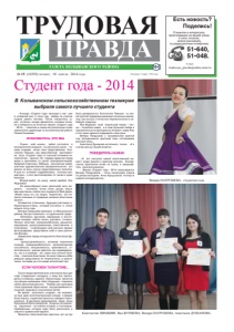 Основана 5 марта 1932 года № 15 (10359) ЧЕТВЕРГ, 10 АПРЕЛЯ 2014 ГОДА Есть новость? Поделись! О важном и интересном, происходящем на вашей улице, в селе, поселке, можно рассказать по редакционным телефонам: 51-640, 51-048. E-mail: trudovaya_pravda@online.sinor.ru ГАЗЕТА КОЛЫВАНСКОГО РАЙОНА ПРАВДА 16+ ТРУДОВАЯ Студент года - 2014 - Конкурс «Студент года» проходит у нас уже в четвертый раз, в этом году заявки на участие подали девять человек. После отборочных туров осталось четыре финалиста, которые сегодня и поборются за почетное звание «Студент года - 2014», - отметила в своем вступительном слове заместитель директора по воспитательной работе Галина Кошмова. ЗНАКОМЬТЕСЬ, ЭТО МЫ - Сцена - мой «конек», дебют состоялся в восьмилетнем возрасте на школьной сцене, - такими словами начал свое представление Константин Пимшин, как единственный претендент на титул «Студент года» от сильной половины человечества – мужчин. Он первым предстал перед жюри и зрителями со своей самопрезентацией. Заядлый спортсмен, КВНщик, местный ди–джей, участник художественной самодеятельности - вот далеко не весь список представленных талантов. А еще он успевает подрабатывать, поэтому каждый день у него распланирован по часам и даже минутам. Второй выйти на сцену выпал жребий Яне Журжевой. - Из разнообразия моих увлечений могу выделить основные: читаю стихи, рисую, вышиваю крестиком, люблю все понемногу! Мой девиз: «Живет лишь тот, кто творит. Творчество - вот великое спасение от страдания, великое облегчение жизни!». Активистка, отличница, будущая участница губернаторского бала, который состоится в конце апреля этого года. Венера Патрушева приехала из Мошковского района, быстро освоилась в студенческой среде. - Увлекаюсь русскими народными и восточными танцами, люблю читать, рисовать, готовить. Личные качества: коммуникабельная, дисциплинированная, целеустремленная, ответственная и позитивная, - сопровождая свой рассказ яркими фотографиями, представила себя и свои увлечения Венера. Завершала парад конкурсантов Анастасия Душанова. - Целеустремлённость, активная жизненная позиция, коммуникабельность, организаторские способности, инициативность, креативность, ответственность, умение работать как индивидуально, так и в команде - вот такие мои личные качества, - отметила Анастасия. Но свое главное хобби девушка представила не теоретически, а практически, поставив на стол жюри аппетитный торт. ЕСЛИ ЧЕЛОВЕК ТАЛАНТЛИВ... После представления всех участников был дан старт следующего конкурса: к нему все претенденты готовились заранее. Презентации проектов под общим названием «Шаг в будущее» поразили своей разноплановостью. Темами для докладов стали здоровый образ жизни, внутрисемейные отношения, здоровье и воспитание детей. Во время «мозгового штурма», так назывался еще один интеллектуальный конкурс в форме блиц-опроса, студентам пришлось изрядно поволноваться. В арсенале председателя жюри Анны Кукушкиной были каверзные вопросы на смекалку, серьезные - на знание истории, и пословицыперевертыши, которые надо было распознать и озвучить правильный вариант. Финалом стали визитные карточки, вот уж где было развернуться. Константин Пимшин со своей группой поддержки разыграл несколько миниатюр, где юноша с легкостью перевоплотился в забавную старушку. Яна Журжева свой творческий номер – песню - посв