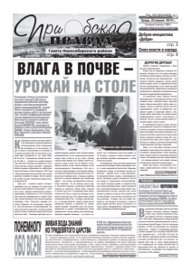 № 17 (9407) сегодня в номере: Среда, 23 апреля 2014 г. Основана 6 августа 1939 г. ПОНЕМНОГУ ОБО ВСЕМ ЖИВАЯ ВОДА ЗНАНИЙ ИЗ ТРИДЕВЯТОГО ЦАРСТВА В СКО пос. Кудряшовского была про- ведена игровая развлекательная про- грамма для учащихся вторых классов местной школы № 25 «В Тридевятом царстве». Отдел информации «Приобской правды» ТЕМА ДНЯ 16+ Окончание на 2-й стр. Добрая инициатива «Добри» стр. 3 Союз власти и народа стр. 4 ÂËÀÃÀ  ÏÎ×ÂÅ – ÓÐÎÆÀÉ ÍÀ ÑÒÎËÅ В минувшую пятницу в концертном зале верх-тулинского ДК прошла традиционная районная агроконфе- ренция с участием руководителей наших сельхозпредприятий, которая обычно проводится в преддверии весенне-полевых работ и наступления сева. В работе конференции приняли участие замминистра регионального министерства сельского хозяйства Александр СОБОЛЕВ, глава района Василий БОРМАТОВ и председатель районного Совета депутатов Владимир САБЛИН. Открыл мероприятие глава Верх-Тулинского сельсовета Николай КОНОНОВ. ÁÞÄÆÅÒÍÛÅ ÏÅÐÅÏÈÒÈÈ Состоялась 32-я сессия Совета де- путатов Новосибирского района. Вел заседание сессии председатель Совета депутатов Владимир САБЛИН. В работе сессии принял участие глава Новоси- бирского района Василий БОРМАТОВ. ДОРОГИЕ ДРУЗЬЯ! Примите искренние поздравления с Днем местного самоуправления! Второй год мы официально отмечаем этот праздник. Несмотря на то что в нашем календаре он появился совсем недавно, важность его несо- мненна. Сегодня местное самоуправление – это наиболее близкий гражданину, жителю нашей области уровень власти. В современной России местное самоуправление стало самой массовой школой демократии. Эффективной, максимально приближенной к проблемам повседневной жизни миллионов людей формой народовластия. За десятилетие своего развития местное самоуправление в Новосибирской области стало значимой силой, способной решать серьезные задачи. Именно ваша работа, работа наших со- граждан, занятых в различных органах местного самоуправления, влияет на комфортность про- живания людей на территории области, села, города, района. Безусловно, это требует высоких профессиональных качеств, ответственности и терпения. Так как от ваших решений зависит от- ношение людей к власти в целом. В Новосибирской области органы местного самоуправления пользуются заслуженным авто- ритетом, их слушают и слышат на самом высоком уровне. Благодаря такой совместной работе, уси- лиям местной власти, депутатского корпуса наша область динамично движется вперед. Мы стро- им новые детские сады, мосты, дороги, школы, больницы и стадионы, укрепляем экономический и инвестиционный потенциал территорий. Важно, что в этой работе активное участие принимают и сами жители. Они приходят с новы- ми идеями и предложениями, готовы принимать самое активное участие в воплощении замыслов в жизнь. Поэтому День местного самоуправления – это праздник десятков тысяч людей, которым не безразлично развитие их малой родины. Желаю вам энергии, неисчерпаемого опти- мизма, профессиональных успехов и новых до- стижений! Владимир ГОРОДЕЦКИЙ, врио Губернатора Новосибирской области В ходе проведения этого мероприятия дети продемонстрировали хорошее знание материа- ла – русских народных сказок. А на сказочной викторине проявили такие качества характе- ра, как честность, справедливость, ответственность, стр