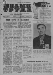 Пролетарии всех стран, соединяйтесь! ОРГАН 3= РАЙКОМА КПСС И НОВОСИБИРСКОЙ РАИСИНОГО СОВЕТА НАРОДНЫХ ОБЛАСТИ наглым вызовом всем людям, ко- мир и справедливость. меж- ,Это УСТЬ-ТАРКСКОГО ДЕПУТАТОВ нистские действия нынешних правителей Ки тая являются торым дороги В трудовых протеста, на которых трудящиеся района еди нодушно заявляют: «Руки прочь от Вьетнама!» печать социа- тре- коллективах проходят митинги МЫ С ТОБОЙ, ВЬЕТНАМ Н. МАКЕЕВ. Шофер Щербаковского хоза. И. КУЛАЧЕНКО. . Тракторист совхоза «Луч». -с. Тихоновка. Радио, телевидение, принесли из далекого диетического Вьетнама весть о разбойном на- Китая. Как участник отечественной войны ВЬЕТНАМ несет все со- «Руки Издается с 1936 года 1 ВТОРНИК, Газета выходит по вторпикам, Цена № 22 (4904) 20 фезраля 1979 года четвергам и субботам. 2 коп. На многострадальной земле Вьетнама вновь льется человеческая кровь. С гневом и возму щением восприняли трудящиеся района страш ную весть ¡о развязывании правящими круга ми Китая агрессивной войны против Социали стической Республики Вьетнам. Агрессивные, великодержавные и экспансио- ПОДДЕРЖИВАЕМ ПРАВОЕ ДЕЛО ВЬЕТНАМА С глубоким возмущеиие-м механизаторы Щербаковско го совхоза восприняли весть о военном вторжении Ки тая на территорию Социалисти ческой Республики Вьетнам. Агрессия Китая, гегемонистичес кие устремления. пекинского- руководства 'являются угрозой делу мира и безопасности ь Вар на ПОДНЯТ В ЧЕСТЬ ЖИВОТНОВОДОВ Бекк Ф. И. — доярки Яр-Матюш- кинокопо совхоза, работающей на до ильной установке с молокопроводом и надоившей за прошедшую неделю фев. раля 2224 кг молока или по 41 кг на корову. Завсеголовой К. В. — доярки Ко винского совхоза, работающей на до ильной установке без молокопровода и надоившей за неделю от группы ко ров 2144 кг-молока или по 71 кг на корову. Геер В. Д. — доярки Яр.Матюш- кинскйго совхоза, надоившей за неде лю от группы первотелок 1034 кг мо лока или по 79 'кг на корову. ч ВЕТЕРАН С чувством глубокого воз мущения услышал я о варском нападении Китая братский: социалистический Вьетнам. Китайские солдаты обстреливают мирные города, гибнут люди. Вновь нарушена мирная жизнь героического народа. Правящими кругами Китая грубо попраны самые вожную падении Великой МИТИНГ ПРОТЕСТА П. Е. Филиппов, механизатор совхоза, отец пятерых детей И. И. Швайцер и другие го ворили о том, что китайское руководство, свою пошло своего вызов дорог Участники митинга заявили: «Руни прочь от Вьетнама!» и решили в эти дни трудиться по-ударному и часть заработ ной платы перечислять в фонд Мира для оказания помощи вьетнамскому народу, ведуще му справедливую борьбу за независимость, суверенитет и территориальную цело с т- ность своей родины. ,М. ИВАНОВ. На центральной усадьбе Щербаковского совхоза состо ялся многолюдный митинг про теста по поводу агрессивной войны, развязанной правящими кругами Китая против вьет намского народа. Механизаторы, животно воды, руководители и специ алисты совхоза,, в своих вы ступлениях заклеймили позо рам агрессивный курс Пеки на, призвали тружеников се ла крепить солидарность с народом Вьетнама. Выступившие на управляющий фермой Ананьев, участница Отечественной войны, ница, В. В. Салона, отец сол дата Советской Армии А. А. Баус, главный ветврач совхоза ВОСТОРЖЕСТВУЕТ ПОБЕДА Китайские агрессоры, ступая против Вьетнама, выс тупили и прот