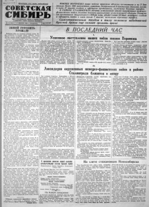 П р о л е т а р и я всех стран, соединяйтесь! ВПОСЛЕДНИЙЧАС С О В Е Т С К АЯ С И Б И РЬ О р г а н Н о в о с и б и р с к о г о о б к о м а и г о р к о м а В К П ( б ) и о б л а с т н о г о С о в е т а д е п у т а т о в т р у д я щ и х с я . № 1 4 ( 7 2 0 1 ) | 17 Я Н В А Р Я 1 9 4 3 г . , в о с к р е с е н ь е . Ц е н а 2 0 к о п . ЮЖНЕЕ ВОРОНЕЖА наши войска прорвали оборону противника и за 3 дня заняли более 600 населенных пунктов. Разгромлены 9 вражеских дивизий, взято в плен 17 тысяч солдат и офицеров противника, захвачены богатые трофеи. В РАЙОНЕ СТАЛИНГРАДА начата генеральная атака окруженных немецкофашистских войск. Заняты важные укрепленные узлы немецкой обороны. Очищена от противника территория в 565 кв. клм, убито свыше 25 тыс. немецких солдат и офицеров, взято в плен около 7 тысяч, захвачены огромные трофеи. Самоотверженным трудом в тылу поможем победоносной Красной Армии еще сильнее громить врага1 ЗИ10И готовить У Р О Ж А Й ! Незабываемо яр к ие дни переживает колхозная деревня. Ш и - роко развернулось, по славному п о ч и ну тамбовцев, могучее движение сельских т р у ж е н и к о в, неиссякаемым потоком т е к у т миллионы трудовых рублей, собранные на т а н ки и самолеты. Вооружая свою родную Красную Армию новыми сотйями боевых машин, колхозники беззаветно и самоотверженно т р удятся на своем посту, чтобы обеспечить страну вдосталь всеми продуктами сельского хозяйства. Зима и в мирные годы требовала от т р у ж е н и к ов деревни дружной подготовки в веспе. Зима всегда во многом решала успех всего сельскохозяйственного года. Что же говорить про нынешние годы военных и с пыт аний !. Вдвойне, втройне должен трудиться к а ж д ый колхозник и колхозница в зимний день, чтобы на полевые работы в ы й ти во всеоружии. К тому же, в нашей области еще не все колхозы выполнили свои обязательства перед государством по сдаче хлеба. Оставаться до сей поры в долгу перед родиной—это преступление. И надо напрячь все усилия, чтобы в ближайшие дни рассчитаться по хлебосдаче полностью. Сотни колхозов показали замечательные образцы подлинной заботы об интересах государства. Сельхозартель имени Аксенова1, К у п и н с к о го района, досрочно выполнив п л ап сдачи хлеба и других продуктов, сдала сверх того 3 . 6 0 0 пудов зерна, 3 9 6 пудов мяса, 6 6 пудов шерсти, много к.ур и т . д. Одновременно колхозники военными темпами начали готовиться к весеннему севу. Взгляните па их поля, свыше 1 1 т ы с яч щитов расставлено там для задержания снега. Аксеновцы — не одиноки. В н о гу с ними идут многие к о лхозы, где люди зарапее заботятся о том, чтобы обеспечить страну хлебом не т^пысо у же собранного у р ожа я, но и у р ожая будущего года. В каждом колхозе сейчас непо ч а тый край работы по подготовке к севу. А время летит птицей. Февраль на пороге. К а ж - дый у п у щ е н н ый день — удар по у р ожаю 1 9 43 года. Надо у же сейчас иметь х о тя бы предварительный план размещения к у л ь т ур и закрепления полевых у ч а с т к ов за бригадами звеньями. Опыт прошлого года показывает, что всякое запоздание с планированием связывает колхозников по ру к ам. Да и в самом деле, о к а к ой работе в бригаде можно говорить сейчас, если люди там еще пе з н з ют ни своих у ч а с т к о в, заданий. Надо немедленно вооружить бригады и звенья ч е т к ой программой зимних работ на к о н к р е т н ых полевых у ч а с т к а х. Первое дело в борьбе за выс о к ий урожай 1 9 43 года — это р о д за озимыми к у л ь т у 