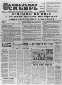 Пролетарии всех стран, соединяйтесь! С О В Е Т С К А Я Газета основана 1 октября 1919 г. ОРГАН НОВОСИБИРСКОГО ОБКОМА КОММУНИСТИЧЕСКОЙ ПАРТИИ СОВЕТСКОГО СОЮЗА И ОБЛАСТНОГО СОВЕТА НАРОДНЫХ ДЕПУТАТОВ ЧИТАЙТЕ’ В НОМЕРЕ К 234 (20388) + Практическими делами углублять перестрой ку. В помощь пропагандисту (стр. 2— 3). 1 1 «Эффект» Волкова. Рассказы о коммунистах (стр. 2). ОКТЯБРЯ 1987 г. + Реальный и полный хозрасчет. Экономиче ский словарь (стр. 2). ВОСКРЕСЕНЬЕ ^ Дни культуры Бурятии в Новосибирской об ласти (стр. 3). Цена 3 коп. ^ «Красный факел» поднимает занавес. К от крытию театрального сезона (стр. 3). + Сибирь — мой край родной (стр. 4). П Р И З Ы В Ы Ц К К П С С к 70 -летию Великой Октябрьской социалистической революции 1 . Да здравствует 70-летие Великой Октябрьской социалистиче ской революции! 2. Слава Великому Октябрю, открывшему новую эру в истории че ловечества! 3. Пусть живет в веках имя и дело Владимира Ильича Ленина! 4. Честь и слава ветеранам ленинской гвардии, участникам рево люции и гражданской войны! 5. Вечная память героям, павшим в борьбе за дело Октября, сво боду и независимость Советской Родины! 6. Да здравствует нерушимый союз рабочего класса, колхозного крестьянства, народной интеллигенции! 7. Да здравствует героический советский народ и его испытанный авангард — ленинская Коммунистическая партия Советского Союза! 8. Коммунисты! Настойчиво и последовательно, по-большевистски проводите в жизнь курс XXVII съезда КПСС! Новыми успехами, реаль ными результатами в перестройке встретим XIX Всесоюзную партийную конференцию! 9. Трудящиеся Советского Союза! Творчески осуществляйте рево люционное дело перестройки, обновления жизни общества! 10. Трудящиеся СССР! Активно участвуйте в реформе управления экономикой! Овладевайте экономическими знаниями, смело внедряй те новые методы хозяйствования, передовой опыт, прогрессивные формы организации и стимулирования труда, хозрасчет и самофинанси рование! 11. Труженики Страны Советов! Везде и во всем занимайте актив ную жизненную позицию, упорным трудом укрепляйте могущество Родины! Развивайте социалистическое соревнование! > Энергию перестройки — делу социализма! 12. Работники агропромышленного комплекса! Настойчиво бори тесь за выполнение Продовольственной программы! Осваивайте ин тенсивные технологии, хозяйственный расчет, распространяйте коллек тивный и семейный подряд, энергично решайте социальные проблемы села! 13. Советские ученые, конструкторы, изобретатели! Сосредоточи вайте усилия на решении коренных научно - технических проблем, обеспечивающих ускоренное развитие экономики, вывод отечествен ного производства на высший мировой уровень! 14. Трудящиеся Страны Советов! Будьте подлинными хозяевами на своем рабочем месте, в трудовом коллективе и в обществе в целом! 15. Граждане Страны Советов! Утверждайте высокие принципы социалистической нравственности и социальной справедливости! Реши тельно искореняйте бюрократизм и волокиту, уравниловку и иждивен чество! 16. Граждане СССР! Активно участвуйте в управлении страной, раз вивайте гласность, критику и самокритику, повышайте требователь ность и ответственность — неотъемлемые черты социалистической де мократии! 17. Народные депутаты! Повышайте роль Советов в комплексном экономическом и социальном развитии, в проведении в жизнь принци пов социалистическог