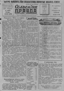 БЫСТРЕЕ ВЫПОЛНИТЬПЛАНХЛЕБОЗАГОТОВОК,ПОЛНОСТЬЮ ЗАСЫПАТЬ СЕМЕНА Обязательство нашего рай он дать Родине не менее 3,8 млн. пудов хлеба Пролетарии всех стран, соединяйтесь! Орган Доволенсього райкома КПСС и районного Совета д е п у т а т о в ' т р у д я щ и х с я . Н о в п о - г / Я и т ю ъ 'п А п б т г т ц Навстречу 40-й годовщине Великого Октября Близится всенародный празд-, ник—сорокалетие Великой Октябрьской социалистической революции. Трудящиеся нашего района вместе со всем советским народом готовятся достойно отметить эту знаменательную годовщину. Для каждого труженика нет более почетной задачи, как самоотверженным трудом на полях помочь своему колхозу, совхозу, в целом району в ближайшие дни выполнить государственный план хлебозаготовок и убрать весь урожай. Можно назвать десятки хлеборобов, которые не жалея сил и не считаясь с отдыхом, трудятся для того, чтобы успешно выполнить свои обязательства. Так поступают члены колхоза «Путь Ленина», сдающие хлеб государству сверх годового плана, члены колхозов им. Кирова, «XIX парт- съезд», «Сибирь» и хлеборобы совхоза «Центральный», завершаютцие выполнение государственного плана хлебозаготовок. Широко известны имена передовых маЕиинистов и комбайнеров тт. Клауса, Каренского, Кирсенко, Герасименко, Усольцева и многих других, чей труд является образцом для всех механизаторов. По 16—20 часов трудятся на отвозке и вывоз!£е хлеба многие шоферы. Среди них особо заслуживают похвалы шоферы тт. Кошелев, Меще- ряков, Рябков, Шишов, Чубич, Швецов, Гвоздецкий и другие. Однако у нас в ряде хозяйств еще не завершена уборка урожая, много хлеба лежит еще в валках. К таким относятся артели «Путь к коммунизму», им. Калинина, «Комсомолец», им. Булганина. В этих колхозах далеко ещё и до выполнения плана хлебосдачи. Плохо проводится уборка картофеля, особенно в колхозах «Ударник», им. Булганина. Труженикам этих и других артелей следует удвоить напряжение в труде, чтобы как можно быстрее убрать с полей урожай, рассчитаться с государством по хлебосдаче. А сколько прндстоит работы по подъему целины, распахано которой ещё мало, по скирдованию соломы, наконец, по подвозке кормов к фермам, но приведению в порядок животноводческих помещений. Встоду требуются заботливые неутомимые руки хлеборобов и животноводов. Товарищи колхозники,рабочие МТС и совхозов, горожане! Еще шире развертывай те социалистическое соревнование за достойную встречу 40-й годовщины Великой Октябрьской социалистической революции. Приложим столько сил, чтобы в текущей пяти-1 дневке наш район е ю л н о с т ью : завершил выполнение плана 1 хлебозаготовок и убрал весь урожай зерновых икартофеля.! Наряду с этим необходимо широким фронтом развернуть подготовку земли под урожай будущего года — распашку новых земель и взмет зяби.I Заскирдовать всео солому. | Обязанность руководителей колхозов, МТС и совхозов, I партийных организаций соз-1 дать необходимые условия участникам предоктябрьского! соревнования, всячески поощряя их. Трудящиеся нашего района | брали обязательство досрочно! рассчитаться с государством 1 по денежным и натуральным платежам. Однако налоги собраны пока на 89 процентов к годовому плану. Тем, кто является до сих пор дол- жниесом, нельзя забывать об этом и следует быстрее завершить расчеты с государством по денежным платежам и обязательным