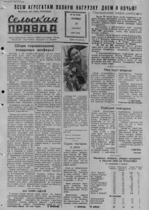 УБОРКА—ВЕНЕЦ ВСЕЙ РАБОТЫ: ТРУДИСЬ УМЕЛО, ДО ПОТА ЖАТВА В ХАКАССИИ Красноярский край Совхозы и колхозы, осваивающие целинные земли в Хакасской автономной области, вырастили хороший урожай герновых. Только совхозы Ширинского района сдадут государству не менее 6 миллионов пудов зерна. На снимке: косовица хлебов в целинном совхозе „Борец“. Фото Ю. Бармина. Фотохроника ТАСС. Впереди третья бригада В битве Погожий сентябрьский день. Солнце еще греет, но уже чувствуется прохлада осени. В синем небе то там, то здесь медленно длинными стаями тянутся журавли. Подъезжаем к массивам пшеницы. Окрест грохочут машины: тракторы, комбайны, грузовики. Вот один за дру гим показались два степных корабля—два комбайна „С-6“. На одном из них Петр Ситкин, на другом—Роберт Вайс. В четвертом производственном участке колхоза „Гигант“ их зовут друзь- ями-соперниками' Оба молодые, задорные в работе. Петр Ситкин за штурвалом комбайна второй год. В прошлом году он подобрал валки на площади 612 гектаров и намолотил 9700 центнеров хлеба, заняв первое место среди' комбайнеров колхоза и второе— в районе. Нынче Петр взял обязательство убрать 600 гектаров. Несмотря на плохую погоду, он за первую пятидневку скосил хлеба на площади 181 гектара.Во второй пятидневке Петр подобрал валки на 117 гектарах и намолотил 1200 центнеров зерна. Сейчас коллектив агрегата уже подобрал 270 Га и намолотил 2406 центнеров сибирского хлеба. Роберт Вайс не отстаНорму перевыполняют Ширится соревнование за быстрейшее проведение уборки урожая среди механизаторов четвертого отделения совхоза „Центральный“. В. Кирсенко безлафет- ной жаткой скашивает по 20 гектаров ежедневно, выполняя сменное задание на 165 процентов. Дмитрий Бобылев за 13 рабочих дней свалил в валки 238 гектаров хлебов, а Семен Донцов тоже безлафетной жаткой—251 гектар. Хорошо пошла работа и у комбайнеров. А. Батов за четыре последних дня подобрал валки с площади 78 гектаров вместо 52 по норме, комбайнер Н. Коломыльцев— 84, а И. Рассолов — 87 гектаров. Добросовестно трудят ся приехавшйй на помощь из Ленинградской области шофер Гусев и совхозный шофер Ганеев. День и ночь они отвозят зерно от комбайнов, выполняя задание на 1 30—150 процентов. С. донцов. Заведующий клубом. за хлеб ет. Он тояге взял обязательство—убрать 600 гектаров. Его агрегатом уже подобраны валки на площади 240 гектаров, намолочено 2228 центнеров зерна. После трудового дня мы беседуем с Петром Ситкиным и Робертом Вайсом. Перекидываемся шутками, говорим о возможностях повышения производительности тру да. А когда заходит речь о том, кто же из них выйдет победителем, оба застенчиво краснеют. —Трудно сейчас сказать,—оправившись от смущения, говорит Роберт,—Вероятно будем идти ровно. Мы поняли свою оплошность: друзья не нуждаются в агитации, а их решение добиться высокой выработки— твердое. Оно подсказано им чувством ответственности за судьбу урожая, пониманием задач родного колхоза, района, страны. —Высокая производительность труда должна стать законом для каждого советского человека, —говорит Петр Ситкин. —В стране ширится соревнование в честь предстоящего Пленума ЦК КПСС, вот и мы решили сделать скромный подарок родной партии. Беседа закончилась. Мы нисколько не сомневаемся, что благородное стремление двух молодых механизаторов—выполнить обязательство — будет осущест