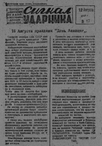 [рздштарии «сех шт стран, соедйняйтесь С■А! и'■у ¿оаоА^сйогэ \ т е.ы.пй) т п ш м д щ ;.дов$льш < АП. СМС?. «РАЯ 12 Августа ■ ^9,4 г . Я 17 ' 18 Августа праздник ■ * ч • * V .. . ' * !: ..,у-<*9 Согласно решение СНК СССР еже « День Авиацкг,,. г*дно 18 А ...уста проводится “День Авиации» Задачами этого массового праздника является. • Мобилизация внимание широчайший масс вокруг укрепления развития на шей советгкой авиации, продвижение айвио-культура в массы трудящихся так кан: исключительно важная роль авиации для дело хозяйственного раз ййтия СССР и обороно способности кашей страны. „ ^ : * Успех дня авиации будет обеспечен только в том случае, если теперь Яе буд«т развернута борьба за то, Зтобы каждый с/совет, партийно—ком сЬмольская организация и организация ОСО к 18 Августа придут с опре деленными показателями, в деле рабо ты сеноуборки, готовность хлебоубор т и сохранение коня. * \^тобы день 18 Августа был, ударном днем по сено—хлебоуборке. В развертывании массовой работы к “дню авиации,, большую роль должен сыграть комсомол, как шеф авио флота и сельские организации ОСО. На местах по указанию р а й о н н ы х *организаций должны будут создать комиссии по руководству праздником и приступить к подготовке его про* рдения. К этому дню заранее необходимо провести кампанию по отчислейию однодневного заработка рабочих, слу &ащих и колхозников на развитие деоавиахимской авиации согласно ре геенне Бюро Крайкома ВКП(б) от 9 Октября 1933 г. ! Комсомольцы должны взять конкретные обязательства по провгдению дня авиации. г Провести ряд докладов в совхозах и коллхозах о задачах воздухофлота. В день проведения необходимо организовать митинги посвященные дно> авиации, постановки пьес, кино, выпуск стенных—живых газет и т* В день авиации добится полного охвата всех членов осоавиахима, организовать военные игры — выступления, привлекал к этому допризывников и отпускников красноармейцев. Во всех бригадах вывесить лозу« ги, \плакаты, сделать так* чтобы «этот праздник действительно явился могу чйм укреплением нашей авиации. , Э1*от праздник пройдет с успехом* если примет участие в подготовка дня ^аиации вся ‘общественность сел, колхозов и совхозов иашего району. Районная Комиссия по чйетке Довив иенской парторганизации доводит до сведения всех членов и кандидату парторганизации, исключенных из пар тии илч переведённых в кандид? ты или сочувствующие, что ею нринима ютсяаппеляции на решения первичных „ комиссий по чистке. "V Во избеженле 'иаантя'Дх поездок коммунистов для апеляций в Краевую комиссию по чистке в Новй-Сибирс)«;, комиссий предупреждает, что аппеяя ции на решения Районной комиссий в Краевую комиссию по Чистке ЩЁ РБСЫЛАЮТСЯ ТОЛЬКО ^ереа ?Ы комиссию по чистка РАЙКОМИССИЯ ПО ЧИОТВЕ ГДР ТИИ.