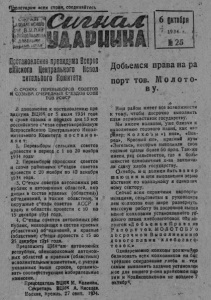 с п и с о к передовых колхозов по ш в о ш а а к а * на 30-1Х включительно. Наимена&йние колхозов Наименование % вып. к год Руководители-колхо , ; / с/соя. *# плануй зов *Г*;4>-;г *. ч*• «1 мая» Ярковский 64,00 Д 0 В Ы Д 0 в «им. Энгельса * Озерский < 62,00 Г о р ш к о в «Вперед» Камарьевск 61,00 Ж е т и н с к и в «Крас. Юг» Яркорский 57,00 " Р у (Ти н «Красный луч» Ярковский 55,00 Д о б р и к с в »Каганович. Озерки * 50,00 * > Г а в р и л о в у -а Ч е р н а я д о е к- а ПОЗОРНО—ОТСТАЮЩИХ ПО ХЛЕБОПОСТАВКАМ НИ 30/1Х ВКЛЮЧИТЕЛЬНО. * * 0 *■ Наименование колхозов «им Сталина» «17 оартконф» «12 лет Октяб I«Новое поле» «1 Д1ая> «Пионер» Наименование п* проц, вып. Г Руководители колхозов с/сой. к год план. • ' г. » , I *■ • Доволенский 14,00 1 Г л а д к и х Баклушевский ' 11.00 [ С к в о р ц о в Плехановский 20,00 С а ф р о н о в Доволеуйкий 13,48 Л а р и н , • Баклуше&ск,. | 18,00 3 е к к о в Романовский I 18,00 Ч е р е п а н о в М. А вот...-; кандидаты на черную доску. ' ✓ Колхозы „1-е Шаги к Социализму" ( р у к о в о д и т е л ь Д р а ч е в ) , „Зо ' ря" Социализма“ ( р у к о в о д и т е л, ь Пш и к ) , им. „2-я пятилетка* ( р у к о в о д . — Г о л о в ч е н к о ) Решать это будет работа в теку щей пятидневки, руководителей дан ных колхозов. Быть-'-ли данным колхозам и их руководителей на черной или крас ной доске? ■' пыть—ли им подвергнутыми адми ^истративным и судебным репресо ням? * Если они по прежнему будут про являть антигосударственные тендем ^ии, го аоследнн* для них будет! Твоарищиселькоры к стешры! Редакция «Сигнал Ударника» про сит посылать ей свои заметки не только под «псевдонимом« но и оба зательно должно быть цодписано фа Милия селькора и его адрес:" Без фамилии материал опублйк# ваться и расследоватьса не будет* Редакция «Сигнал — Ударника». ОТВЕТ. РЕДАКТОР ПОПОВ , / < 4' ' . г Райлито 25 Тираж одна экземпляр тысяча