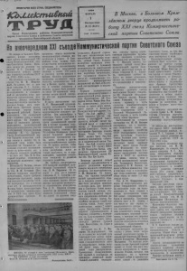 КОЛЛЕГГПТТШЫЯ т р у д 1 февраля 1959 года, № 15 На внеочередном XXI съе зде КПСС Продолжение. Нач. па 1 стр. труда юного поколения советской страны посвящает свою речь Первый Секретарь Центрального Комитета ВЛКСМ В. Е . Семичастный. Тов. Семичастный приводит данные о том, как молодежь активно берёгся за практичёское выполнение заданий семилетнего плана. Наш Двадцать первый съезд — это съезд строителей коммунизма, сказал, выступая в прениях по докладу товарища Н. С. Хрущева, И. В. Спиридонов (Ленинградская партийная организация). Оратор говорит об огромном энтузиазме, с которым воспринят всем советским народом новый план развития народного хозяйства СССР, слан строительства коммунизма. По поручению Мандатной комиссии тов. В . М. Чураев доложил, что на съезд избраны тысяча двести шестьдесят девять делегатов с решающим и сто шесть делегатов с совещательным голосом. В настоящее время КПСС насчитывает 7.622 356 членови 616.775 кандидатов в члены партии. Среди делегатов съезда— 222 женщины. На съезде присутствуют делегаты, иредставля- кщие 52 национальности Советского Союза. Съезд утвердил доклад Мандатной комиссии Выступление тов. Е . А. Фурцевой было посвящено идейно-воспитательной работе партии в массах. Советское государство, сказала Е А. Фурцева, всегда было сильно сознательностью масс. Дальнейшее повышение сознательности трудящихся в условиях выполнения семилетнего плана является одним из решающих факторов. Достижения советскойкуль- туры, подчеркнула тов. Е. А. Фурцева, становятся все более очевидными людям, живущим в зарубежных странах. Идеологи буржуазии не способны про тивопоставить светлым и чистым идеям коммунизма ничего, что могло бы привлечь широкие массы. Им остается только клеветать на коммунизм, изображать его как некоторую угрозу для цивилизации и культуры. Но правда, заявляет тов. Е. А. Фурцева, становится все более очевидной, ее не спрячешь от мира. Семилетний план развития народного хозяйства, обсуждаемый на X X I съезде коммунистической партии, предполагает дальнейший подъем не только всех отраслей промышленности. но и всех отраслей советской культуры. Тепло встретили делегаты съезда появление на трибуне Н. Я. Мамая (Луганская партийная организация). Шахтеры Донбасса, сказал тов. Н. Я. Мамай, горячо одобряют новый семилетний план. Ознакомившись с тезисами доклада товарища Н. С. Хрущева, они заявили о своей готовности досрочно выполнить задания. На вечернем заседании первым выступил тов. Я. Э. К алн - берзия. Он заявил, что семилетний план— это наиболее значительная веха в развитии народного хозяйства СССР в строительстве коммунизма. Оратор подчеркнул, что в результате выиолнения этого плана станет еще более могу- щественным лагерь социализма, будет воздвигнуто непреодолимое препятствие на пути поджигателей войны. Выступившая затем делегат тов. П . Н Ковалева (Гомельский район БССР) рассказала о делах колхоза «За Родину», председателем которого она состоит в течение семи лет. П. И. Ковалева сообщила делегатам о планах этого Белорусского колхоза на предстоящее семилетие. На трибуне Министр Иностранных Дел СССР тов. А . А . Громыко. Оратор говорит, что уже одно опубликование в ноябре прошлого года тезисов доклада Хрущева Двадцать первому съезду КПСС оказало заметное стабилизирующее влияние на всю международную обстановку. До со
