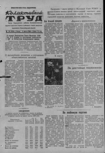X ПРОЛЕТАРИИ ВСЕХ СТРАН, СОЕДИНЯЙТЕСЬ! 1СЬии&сти£нш\ Прошедшие 1 марта выборы в Верховный Совет РСФСР и местные Советы явились яркой демонстрацией советского демо- кратизма, единства и сплоченности партии и народа, горячего стремления досрочно выполнить задания семилетки Орган Карасукского райкома Коммунистической партии Советского Союза и районного Совета депутатов трудящихся Новосибирской области Как большой праздник Дружно' и организованно № 28 (2523) I Спеда, 4 марта 1959г, Щеиз 15 коп. [О поездке Председателя Совета Министров СССР ( tor. Н. С. Хрущева по приглашению правительства ^ ГДР на Лейпцигскую международную ярмарку Правительство Германской Демократической Республики пригласило Председателя Совета Министров Союза С С Р товарища Н . С. Хрущева посетить и ознакомиться с весенней международной ярмаркой в гор, Лейпциге. Товарищ Н. С. Хрущев с благодарностью привял это приглашение и выразил готовность посети ть Г Д Р и ознакомиться с Лейпцигской ярмаркой. О дальнейшем развитии и улучшении ров * общественного питания В предрассветной рани красочно выглядел Заводской.-, избирательный участок № 7, освещенный яркими электрическими лампочками. Еще до начала голосования сюда пришли избиратели, стараясь пораньше выполнить свой гражданский долг. Подача голосов началась организованно. Чувствовалось приподнятое, праздничное настроение. * К услугам голосовавших— большой выбор художественной литературы, работал буфет. Коллектив художественной самодеятельности молочноконсервного комбината показал интересный концерт Как большой всенародный праздник ирошел день выбоМ. Андреев. ■пни Центральный Комитет КПСС и Совет Министров СССР приняли постановление „О дальнейшем развитии и улучшении общественного питания” . В нем подчеркивается, что в нынешних условиях уровень развития общественного питания еще отстает о т b o v,#' ' it' hx потребностей на- |?" не обеспечивает вШташения поставленной задачи— сделать общественное питание более массовым, удобным и выгодным для населения. Центральным комитетам компартий и советам министров союзных республик предложено обеспечить увеличение выпуска продукции предприятий общественного питания в 1965 го д у по сравнению с 1958 годом более чем в два раза, охватив общественным питанием большинство рабочих, служащих и учащихся. Постановлением предусматривается широкое внедрение в предприятиях общественного питания таких прогрессивных форм обслуживания населения, как отпуск обедов на дом, предварительная продажа абонементов и чеков на завтр а- ки, обеды и ужины, д а л ь нейшее распространение и совершенствование самообслуживания. В 1959— 1960 годах б у д у т организованы общественные с т о л о в ы е во всех совхозах как на центральных усадьбах, так и в их крупных отделениях. Колхозам рекомендовано шире развернуть работу по организации колхозных столовых для обслуживания колхозников и членов их семей. Центральный Комитет КПСС и Совет Министров С С СР подчеркивают, что дальнейшее развитие и коренное улучшение дела общественного питания является одной из важнейших задач всех партийных, советских, профсоюзных и хозяйственных органов. (Т А С С ) . Организованно прошли 1 марта выборы в Верховный Совет нашей Республики и местные Советы депутатов трудящихся на Центральном избирательном участке города Карасука. ..