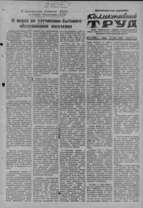 <лел±4,С/ Q$ij' $ edicts d-ci/'nLa. В Центральном Комитете КПСС и Совете Министров СССР О мерах поулучшениюбытового обслуживания населения Центральный Комитет КПСС и Совет Министров СССР рассмотрели вопрос о мерах по улучшению бытового обслуживания населения. В принятом по этому вопро-' су постановлении Центральный Комитет КПСС и Совет Министров СССР исходили из указания X X I съозда Коммунистической партии Советского Союза о том, что. «в современных условиях, когда достигнуты огромные успехи в развитии промышленности и сельского хозяйства, имеются все условия для того, чтобы в ближайшее время советский народ стал жить еще лучше, с более полным удовлетворением своих материальных и духовных потребностей». В нашей стране с каждым годом увеличиваются производство и продажа населению товаров», широкого потребления, трудя-1 щиеся имеют возможность при-® обретать все больше обуви,' одежды, мебели, телевизоров, радиоприемников, швейных и стиральных машин, а также других предметов домашнего обихода. Вместе с этим бы> ctdo растут потребности населения *на различные виды бытовых услуг. Однако существующий в настоящее время уровень бытового обслуживания, как отмечается з постановлении ЦК КПСС и Совета Министров СССР, еще отстает от возросших запросов населения. Во многих городах и рабочих поселках сеть государственных и кооперативных предприятий бытового обслуживания недостаточна. Культура производства и обслуживания заказчиков в ряде мастерских низкая, со стороны трудящихся поступают жалобы на неудовлетворительное качестЕО пошивочных и ремонтных работ, длительные сроки исполнения заказов. Недостаточна сеть мастерских, где бы мелкий ремонт производился в присутствии заказчика, слабо организован ремонт квартир за счет средств граждан. Местная промышленность, промысловая и потребительская кооперация еще неудовлетворительно занимаются бытовым обслуживанием сельского населения. К организации предприятий бытового обслуживания слабо привлекаются средства и возможности колхозов. Предприятия бытового обслуживания недостаточно обеспечиваются оборудованием, тканями, кожевенными товарами, прикладными материалами и запасными частями для ремонта технически сложных предметов домашнего обихода. Делу бытового обслуживания населения не уделяется достаточного внимания со стороны многих местных Советов депутатов трудящихся, партийных, профсоюзных и хозяйственных организаций. Имеющиеся возможности для расширения сети предприятий бы- вого обслуживания в 1969 готового обслуживания и улуч- ду не менее чем до 102,7 ты- шения их работы используют- сячи, в 1960 году— до 126.7 ся недостаточно. Считая эти тысячи, в 1961 году— не ые- предприятия малорентабельны- нее чем до 153,3 тысячи про- ми, некоторые хозяйственные тив 79,6 тысячи в 1958 году, руководители не направляют в „ .на_ необходимых размерах након- мечено огганизовать 29 тысяч ш Г ^ р о Т ш л е н н о с Г н Г 1^ новых пРедприят0Й в0 a™ }жгата*д а 5й “ г ™ г ™ т ,вты « - г . j s s r s s s поНрешемю°ыестны™оветских органов предприятия бытового и^ ультуино бытового назначе- ™ : ДГ0Т0В“ тысячи парикмахерских. Наме- квалифицированных кадров для прППт,1ок,п_гг постнопредприятий бытового обслуии- ™ ь° ? 67 У р и и « е й рямпданш 'ппТ1Ш ^ т о п п п ° ЙЩИК0В’ ЧИСТКИ И КраШвНИЯ ОДвЖДЫ. саножников, мастеров по ре- * монту технически предметов